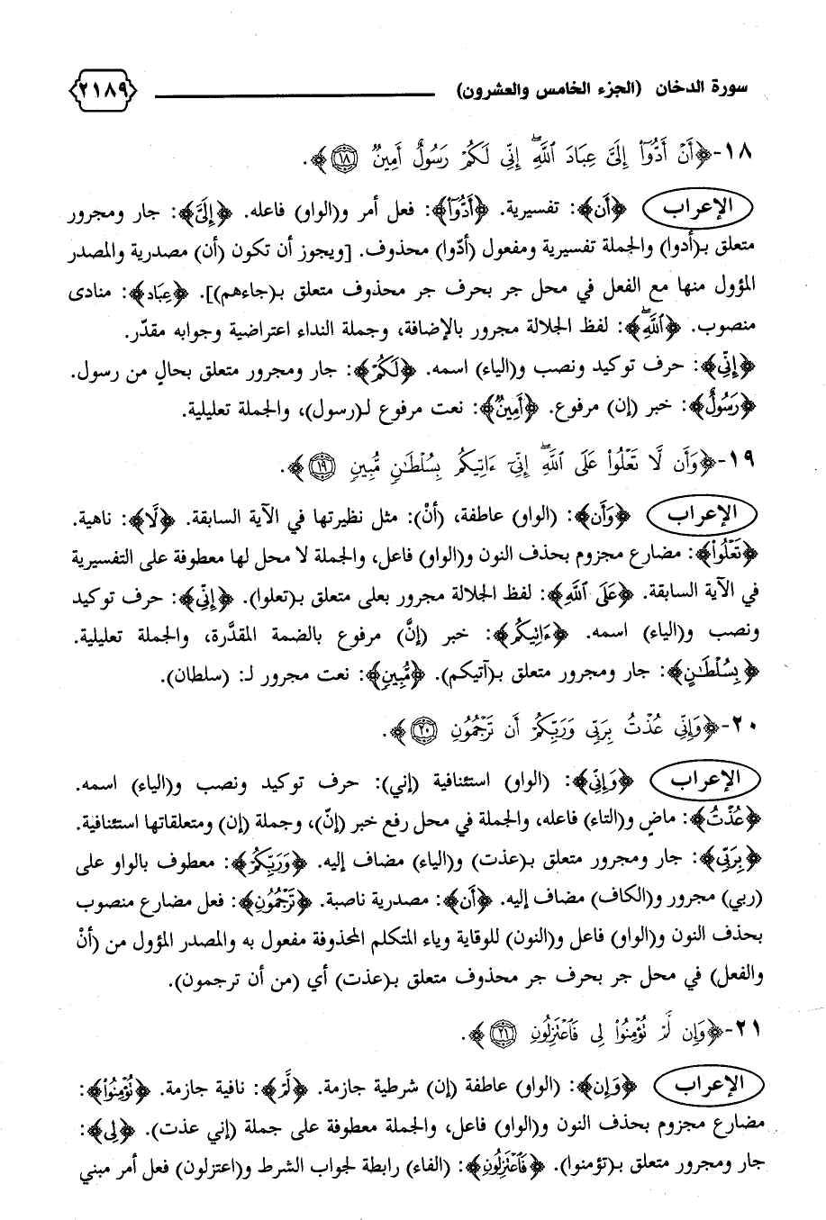 الإعراب {أَنْ}: تفسيرية. {أَدُّوا}: فعل أمر و (الواو) فاعله. {إِلَيَّ}: جار ومجرور متعلق ب (أدوا) والجملة تفسيرية ومفعول (أدّوا) محذوف. [ويجوز أن تكون (أن) مصدرية والمصدر المؤول منها مع الفعل في محل جر بحرف جر محذوف متعلق ب (جاءهم)]. {عِبادَ}: منادى منصوب. {اللهِ}: لفظ الجلالة مجرور بالإضافة، وجملة النداء اعتراضية وجوابه مقدّر.
