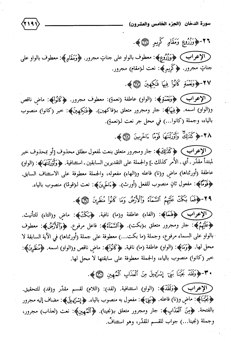 الإعراب {وَزُرُوعٍ}: معطوف بالواو على جنات مجرور. {وَمَقامٍ}: معطوف بالواو على جنات مجرور. {كَرِيمٍ}: نعت ل (مقام) مجرور.