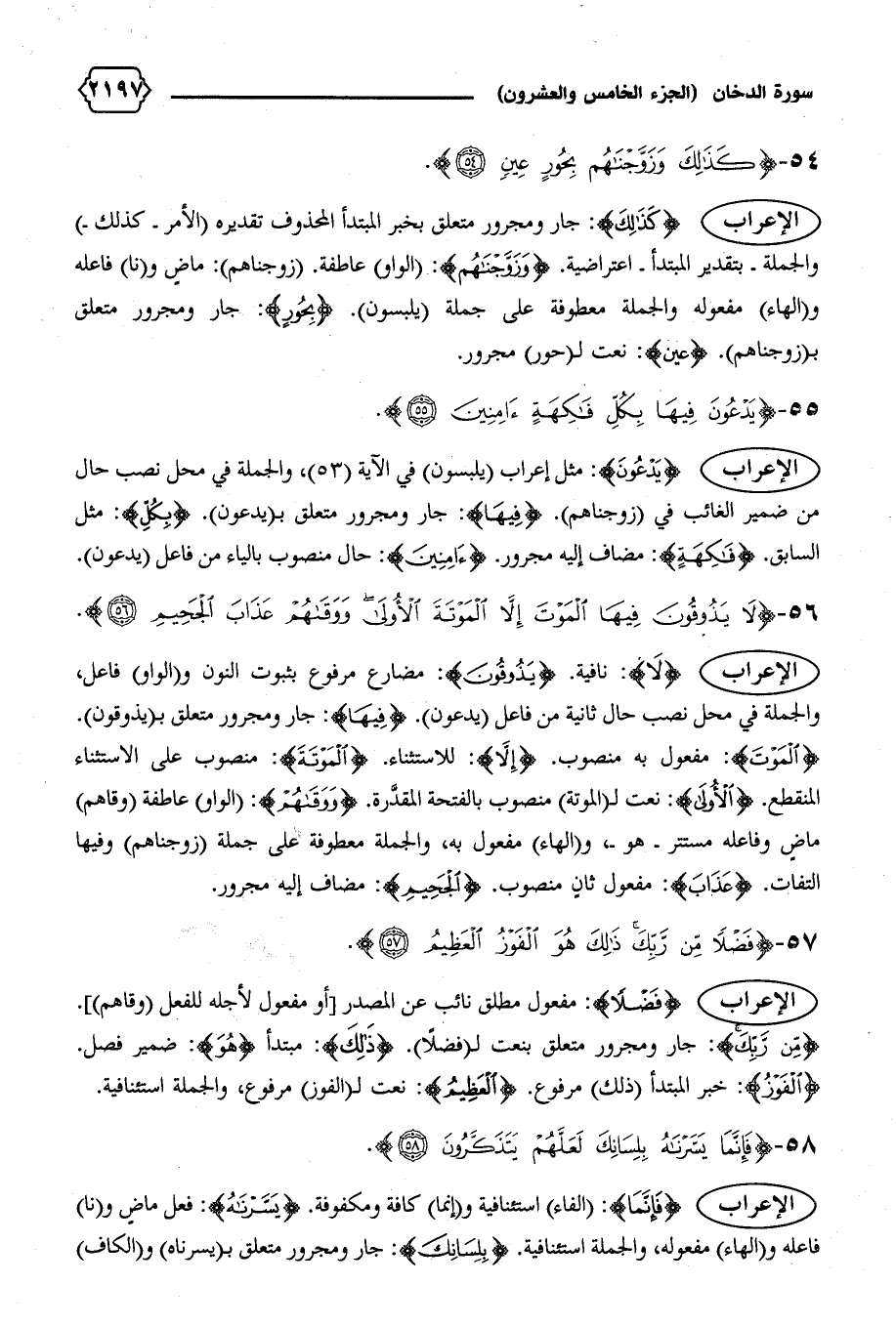 الإعراب {يَدْعُونَ}: مثل إعراب (يلبسون) في الآية (٥٣)، والجملة في محل نصب حال من ضمير الغائب في (زوجناهم). {فِيها}: جار ومجرور متعلق ب (يدعون). {بِكُلِّ}: مثل السابق. {فاكِهَةٍ}: مضاف إليه مجرور. {آمِنِينَ}: حال منصوب بالياء من فاعل (يدعون).