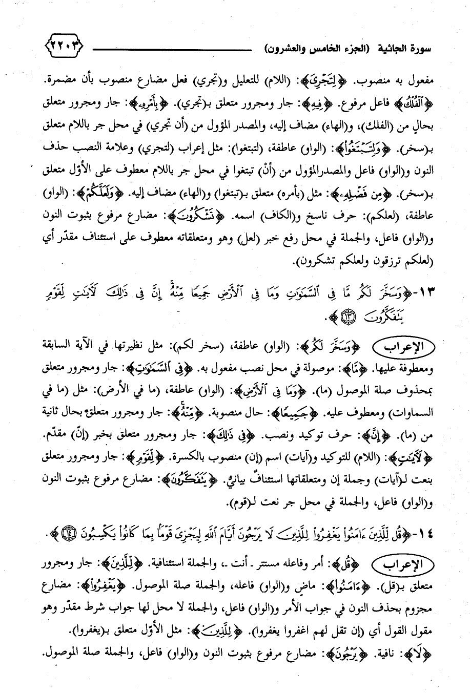 {الْفُلْكُ}: فاعل مرفوع. {فِيهِ}: جار ومجرور متعلق ب (تجري). {بِأَمْرِهِ}: جار ومجرور متعلق بحال من (الفلك)، والهاء) مضاف إليه، والمصدر المؤول من (أن تجري) في محل جر باللام متعلق ب (سخر). {وَلِتَبْتَغُوا}: (الواو) عاطفة، (لتبتغوا): مثل إعراب (لتجري) وعلامة النصب حذف النون و (الواو) فاعل والمصدر المؤول من (أن) تبتغوا في محل جر باللام معطوف على الأوّل متعلق ب (سخر). {مِنْ فَضْلِهِ}: مثل (بأمره) متعلق ب (تبتغوا) و (الهاء) مضاف إليه. {وَلَعَلَّكُمْ}: (الواو) عاطفة، (لعلكم): حرف ناسخ و (الكاف) اسمه. {تَشْكُرُونَ}: مضارع مرفوع بثبوت النون و (الواو) فاعل، والجملة في محل رفع خبر (لعل) وهو ومتعلقاته معطوف على استئناف مقدّر أي (لعلكم ترزقون ولعلكم تشكرون).