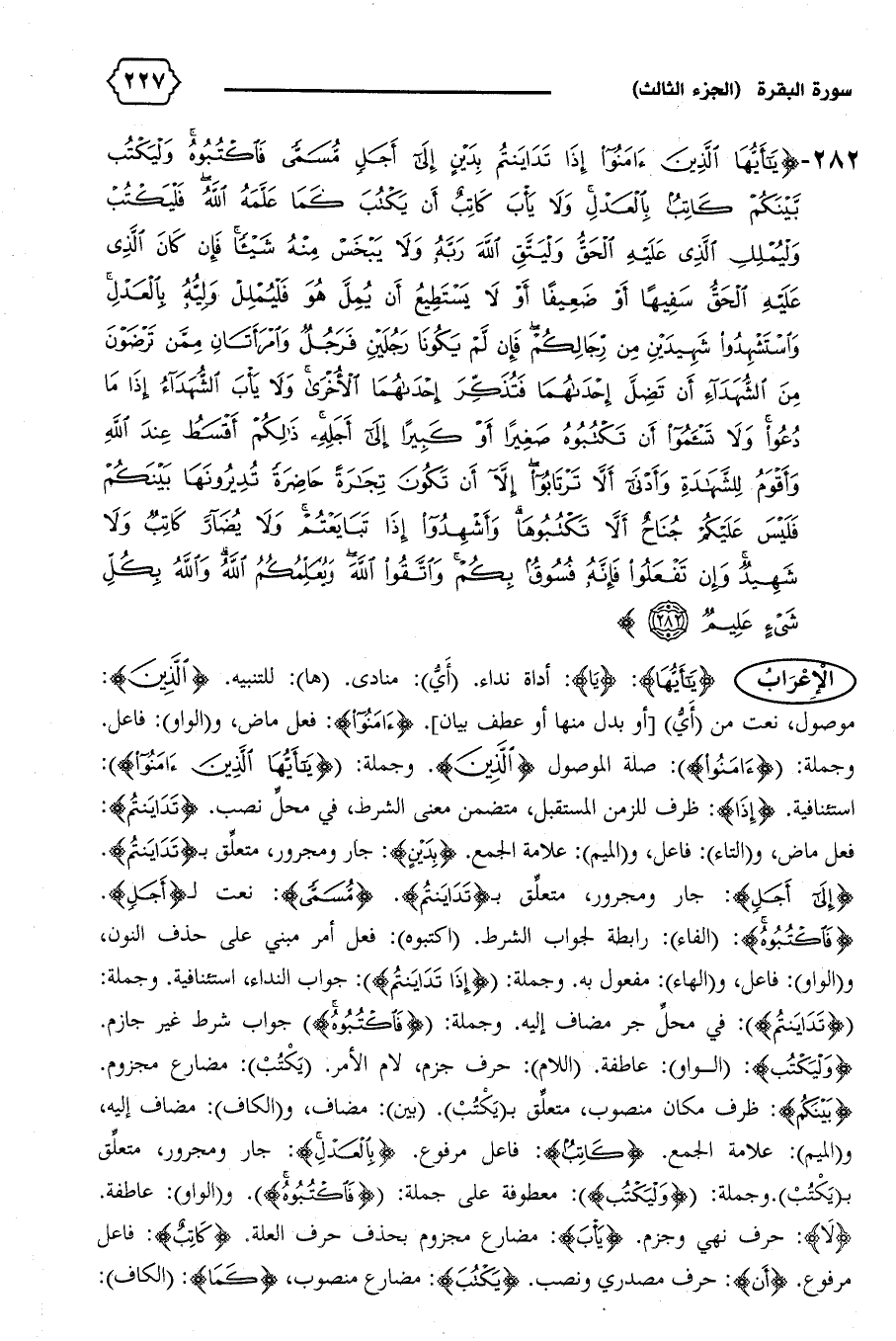 ٢٨٢ - {يا أَيُّهَا الَّذِينَ آمَنُوا إِذا تَدايَنْتُمْ بِدَيْنٍ إِلى أَجَلٍ مُسَمًّى فَاكْتُبُوهُ وَلْيَكْتُبْ بَيْنَكُمْ كاتِبٌ بِالْعَدْلِ وَلا يَأْبَ كاتِبٌ أَنْ يَكْتُبَ كَما عَلَّمَهُ اللهُ فَلْيَكْتُبْ وَلْيُمْلِلِ الَّذِي عَلَيْهِ الْحَقُّ وَلْيَتَّقِ اللهَ رَبَّهُ وَلا يَبْخَسْ مِنْهُ شَيْئاً فَإِنْ كانَ الَّذِي عَلَيْهِ الْحَقُّ سَفِيهاً أَوْ ضَعِيفاً أَوْ لا يَسْتَطِيعُ أَنْ يُمِلَّ هُوَ فَلْيُمْلِلْ وَلِيُّهُ بِالْعَدْلِ وَاِسْتَشْهِدُوا شَهِيدَيْنِ مِنْ رِجالِكُمْ فَإِنْ لَمْ يَكُونا رَجُلَيْنِ فَرَجُلٌ وَاِمْرَأَتانِ مِمَّنْ تَرْضَوْنَ مِنَ الشُّهَداءِ أَنْ تَضِلَّ إِحْداهُما فَتُذَكِّرَ إِحْداهُمَا الْأُخْرى وَلا يَأْبَ الشُّهَداءُ إِذا ما دُعُوا وَلا تَسْئَمُوا أَنْ تَكْتُبُوهُ صَغِيراً أَوْ كَبِيراً إِلى أَجَلِهِ ذلِكُمْ أَقْسَطُ عِنْدَ اللهِ وَأَقْوَمُ لِلشَّهادَةِ وَأَدْنى أَلاّ تَرْتابُوا إِلاّ أَنْ تَكُونَ تِجارَةً حاضِرَةً تُدِيرُونَها بَيْنَكُمْ فَلَيْسَ عَلَيْكُمْ جُناحٌ أَلاّ تَكْتُبُوها وَأَشْهِدُوا إِذا تَبايَعْتُمْ وَلا يُضَارَّ كاتِبٌ وَلا شَهِيدٌ وَإِنْ تَفْعَلُوا فَإِنَّهُ فُسُوقٌ بِكُمْ وَاِتَّقُوا اللهَ وَيُعَلِّمُكُمُ اللهُ وَاللهُ بِكُلِّ شَيْءٍ عَلِيمٌ (٢٨٢)}