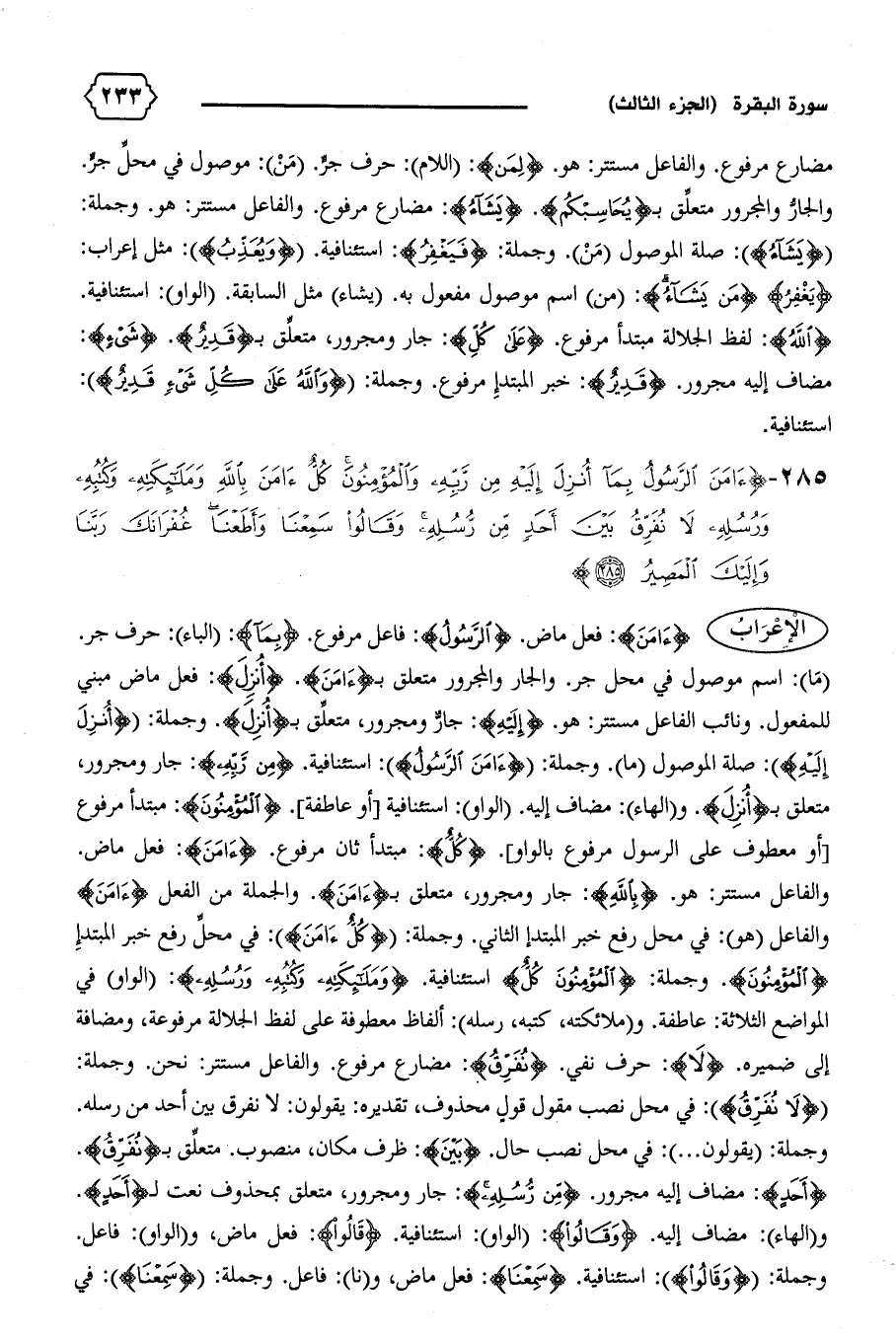 (ما): اسم موصول في محل جر. والجار والمجرور متعلق ب‍ {آمَنَ}. {أُنْزِلَ}: فعل ماض مبني للمفعول. ونائب الفاعل مستتر: هو. {إِلَيْهِ}: جارّ ومجرور، متعلّق ب‍ {أُنْزِلَ}. وجملة: {أُنْزِلَ إِلَيْهِ}: صلة الموصول (ما).وجملة: {آمَنَ الرَّسُولُ}: استئنافية. {مِنْ رَبِّهِ}: جار ومجرور، متعلق ب‍ {أُنْزِلَ}. و (الهاء): مضاف إليه. (الواو): استئنافية. [أو عاطفة]. {الْمُؤْمِنُونَ}: مبتدأ مرفوع [أو معطوف على الرسول مرفوع بالواو]. {كُلٌّ}: مبتدأ ثان مرفوع. {آمَنَ}: فعل ماض.