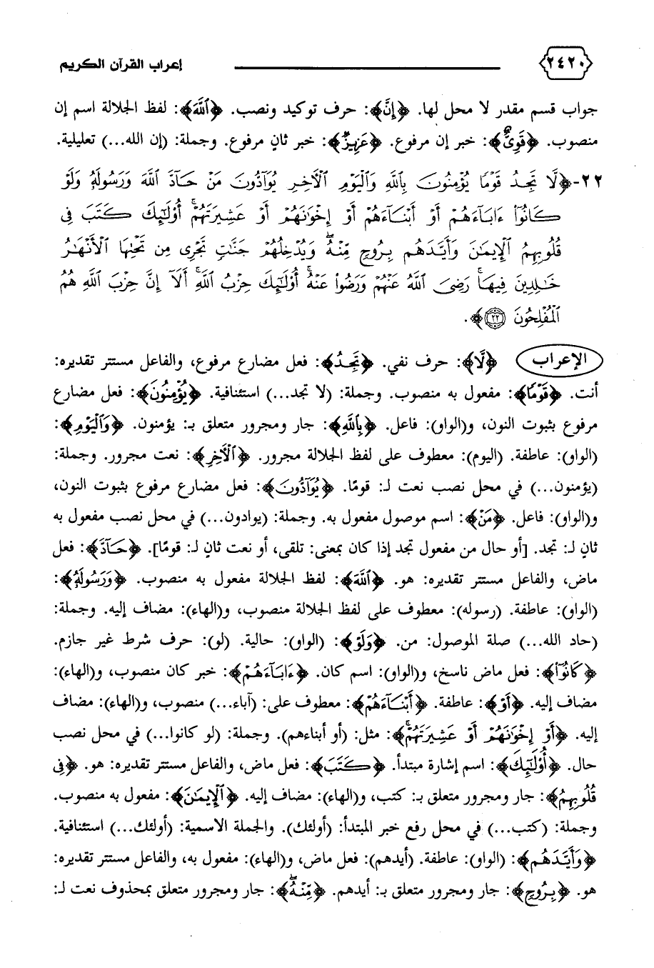 مضاف إليه. {أَوْ}: عاطفة. {أَبْناءَهُمْ}: معطوف على: (آباء ... ) منصوب، و (الهاء): مضاف إليه. {أَوْ إِخْوانَهُمْ أَوْ عَشِيرَتَهُمْ}: مثل: (أو أبناءهم).وجملة: (لو كانوا ... ) في محل نصب حال. {أُولئِكَ}: اسم إشارة مبتدأ. {كَتَبَ}: فعل ماض، والفاعل مستتر تقديره: هو. {فِي قُلُوبِهِمُ}: جار ومجرور متعلق ب: كتب، و (الهاء): مضاف إليه. {الْإِيمانَ}: مفعول به منصوب.