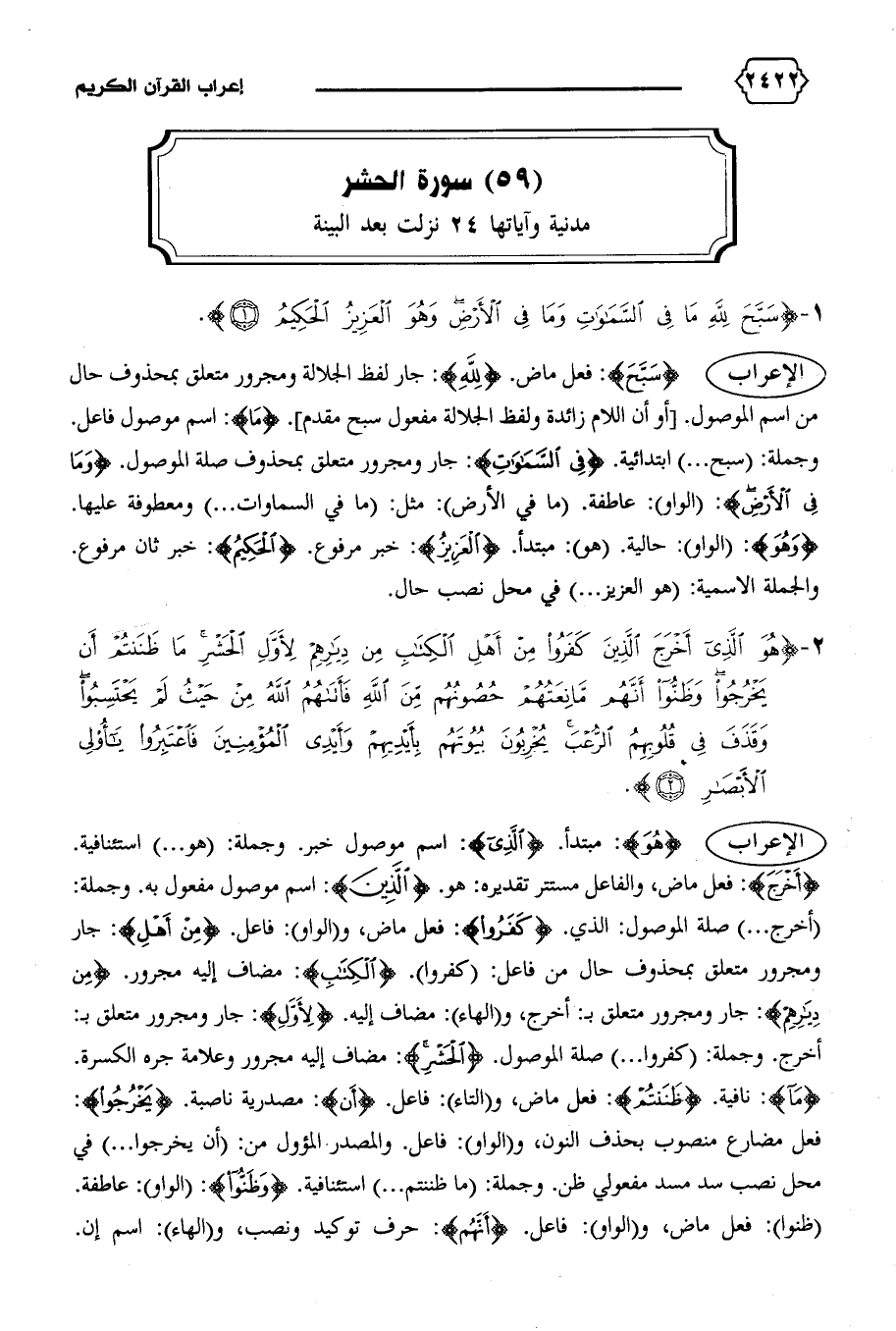 (أخرج ... ) صلة الموصول: الذي. {كَفَرُوا}: فعل ماض، و (الواو): فاعل. {مِنْ أَهْلِ}: جار ومجرور متعلق بمحذوف حال من فاعل: (كفروا). {الْكِتابِ}: مضاف إليه مجرور. {مِنْ دِيارِهِمْ}: جار ومجرور متعلق ب‍: أخرج، و (الهاء): مضاف إليه. {لِأَوَّلِ}: جار ومجرور متعلق ب‍: