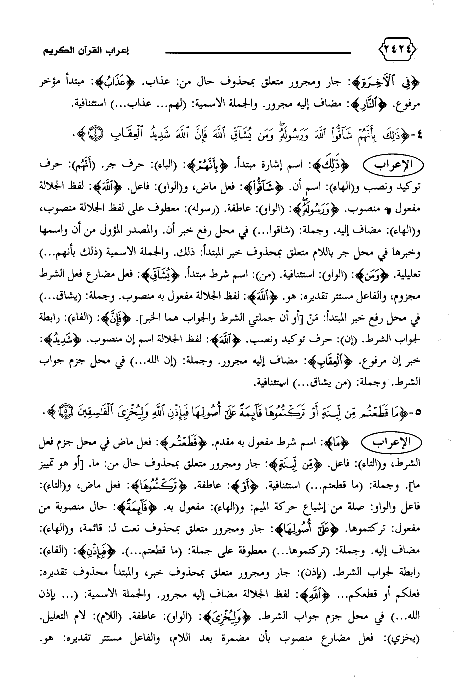 الإعراب {ما}: اسم شرط مفعول به مقدم. {قَطَعْتُمْ}: فعل ماض في محل جزم فعل الشرط، و (التاء): فاعل. {مِنْ لِينَةٍ}: جار ومجرور متعلق بمحذوف حال من: ما. [أو هو تمييز ما].وجملة: (ما قطعتم ... ) استئنافية. {أَوْ}: عاطفة. {تَرَكْتُمُوها}: فعل ماض، و (التاء):