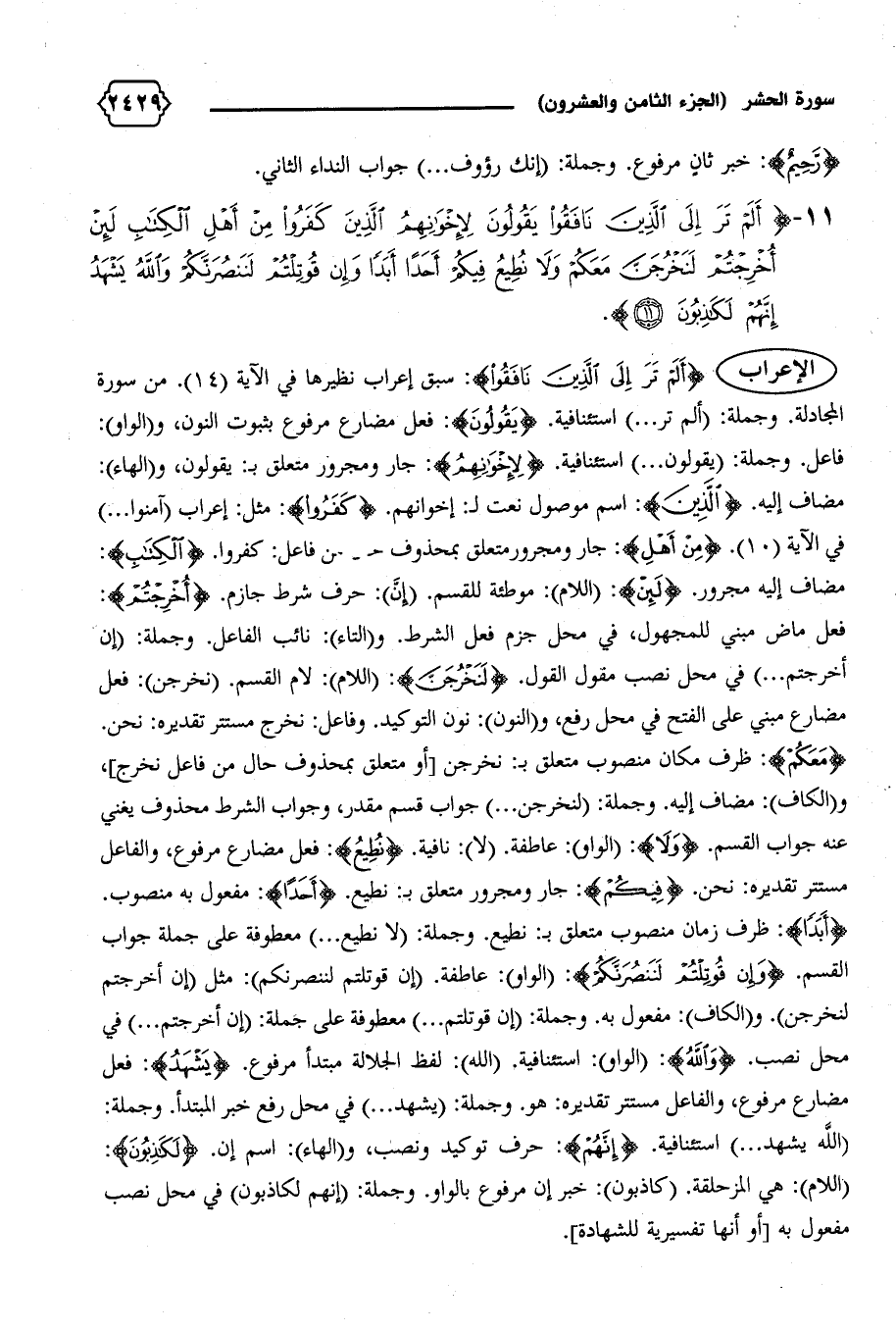 الإعراب {أَلَمْ تَرَ إِلَى الَّذِينَ نافَقُوا}: سبق إعراب نظيرها في الآية (١٤).من سورة المجادلة. وجملة: (ألم تر ... ) استئنافية. {يَقُولُونَ}: فعل مضارع مرفوع بثبوت النون، و (الواو):