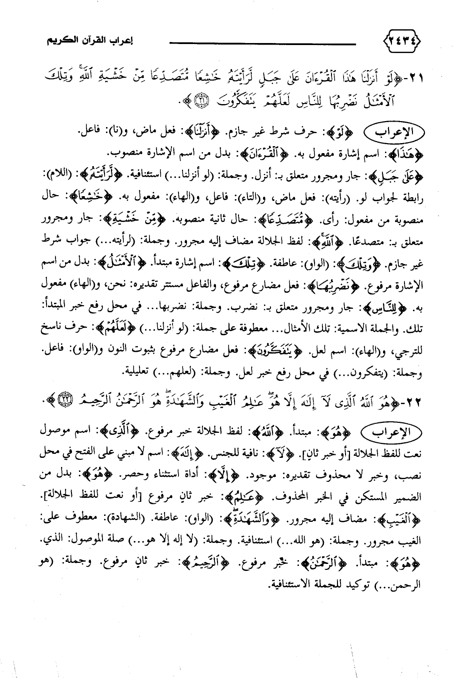 رابطة لجواب لو. (رأيته): فعل ماض، و (التاء): فاعل، و (الهاء): مفعول به. {خاشِعاً}: حال منصوبة من مفعول: رأى. {مُتَصَدِّعاً}: حال ثانية منصوبة. {مِنْ خَشْيَةِ}: جار ومجرور متعلق ب: متصدعا. {اللهِ}: لفظ الجلالة مضاف إليه مجرور. وجملة: (لرأيته ... ) جواب شرط غير جازم. {وَتِلْكَ}: (الواو): عاطفة. {تِلْكَ}: اسم إشارة مبتدأ. {الْأَمْثالُ}: بدل من اسم الإشارة مرفوع. {نَضْرِبُها}: فعل مضارع مرفوع، والفاعل مستتر تقديره: نحن، و (الهاء) مفعول به. {لِلنّاسِ}: جار ومجرور متعلق ب: نضرب. وجملة: نضربها ... في محل رفع خبر المبتدأ: