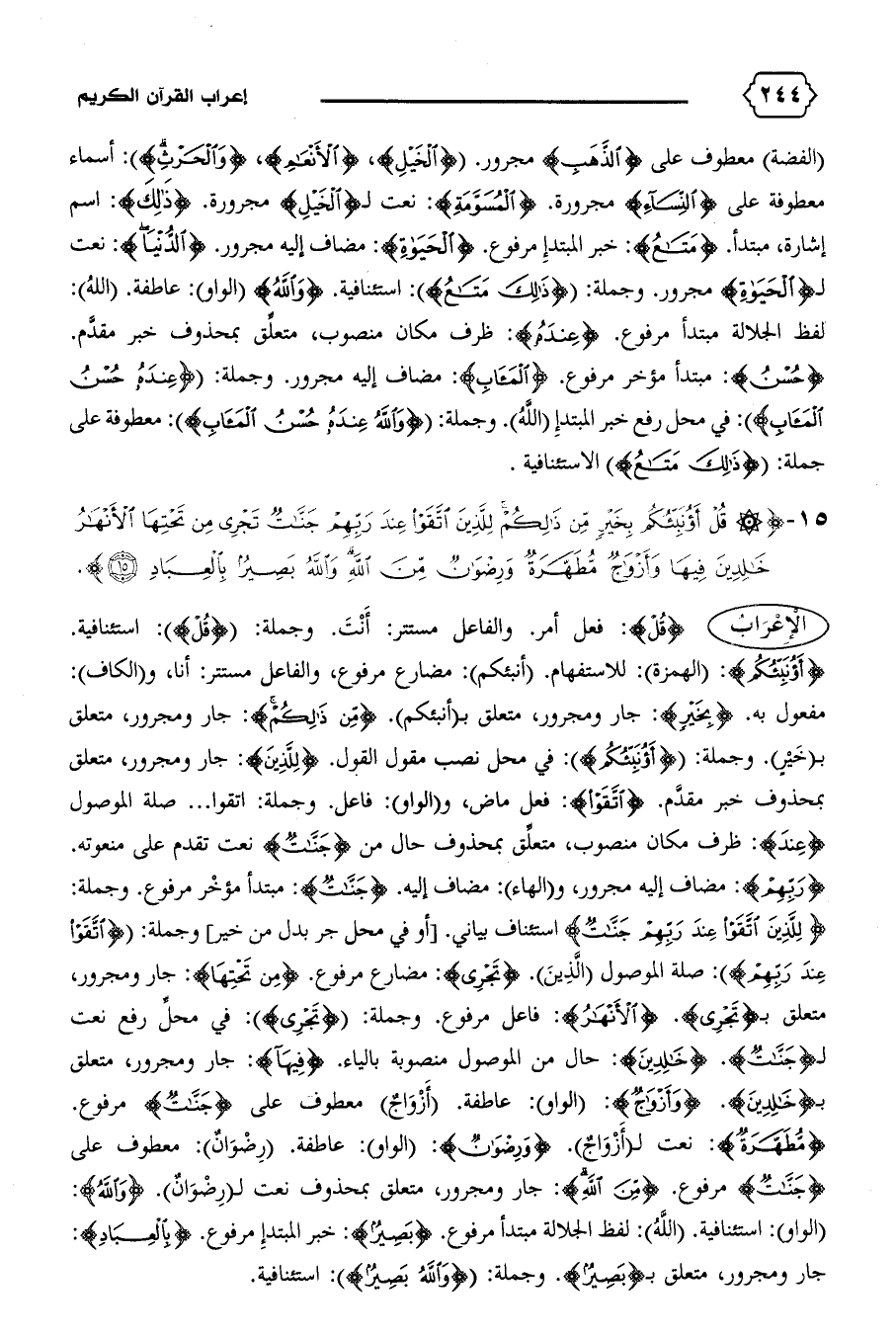 {لِلَّذِينَ اتَّقَوْا عِنْدَ رَبِّهِمْ جَنّاتٌ} استئناف بياني. [أو في محل جر بدل من خير] وجملة: {اتَّقَوْا عِنْدَ رَبِّهِمْ}: صلة الموصول (الّذين). {تَجْرِي}: مضارع مرفوع. {مِنْ تَحْتِهَا}: جار ومجرور، متعلق ب‍ {تَجْرِي}. {الْأَنْهارُ}: فاعل مرفوع. وجملة: {تَجْرِي}: في محلّ رفع نعت ل‍ {جَنّاتٌ}. {خالِدِينَ}: حال من الموصول منصوبة بالياء. {فِيها}: جار ومجرور، متعلق ب‍ {خالِدِينَ}. {وَأَزْواجٌ}: (الواو): عاطفة. (أزواج) معطوف على {جَنّاتٌ} مرفوع.