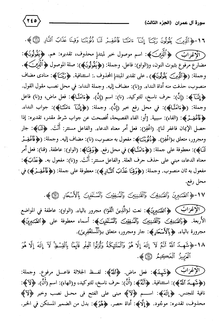 {الصّابِرِينَ}: نعت ل‍ (الّذين اتّقوا) مجرور بالياء. (الواو): عاطفة في المواضع الأربعة. {وَالصّادِقِينَ وَالْقانِتِينَ وَالْمُنْفِقِينَ وَالْمُسْتَغْفِرِينَ}: أسماء معطوفة على {الصّابِرِينَ} مجرورة بالياء. {بِالْأَسْحارِ}: جار ومجرور، متعلق ب‍ (المستغفرين).