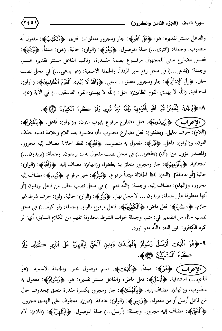 حالية [أو عاطفة]. (الله): لفظ الجلالة مبتدأ مرفوع. {مُتِمُّ}: خبر مرفوع. {نُورِهِ}: مضاف إليه مجرور، و (الهاء): مضاف إليه. وجملة: (الله متم ... ) في محل نصب حال. من فاعل يريدون [أو أنها معطوفة على جملة: يريدون ... لا محل لها]. {وَلَوْ}: (الواو): حالية.) (لو): حرف شرط غير جازم. {كَرِهَ}: فعل ماض، {الْكافِرُونَ}: فاعل مرفوع بالواو. وجملة: (لو كره ... ) في محل نصب حال من الضمير في: متم. وجملة جواب الشرط محذوفة تفهم من الكلام السابق، أي: لو كره الكافرون نور الله، فالله متم نوره.
