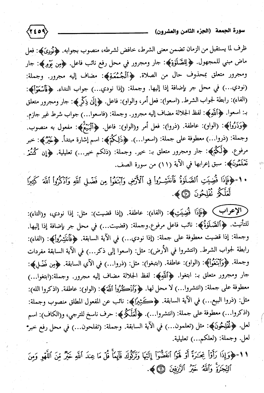 رابطة لجواب الشرط. (انتشروا في الأرض): مثل: (اسعوا إلى ذكر ... ) في الآية السابقة مفردات وجملة. {وَابْتَغُوا}: (الواو): عاطفة. (ابتغوا): مثل: (ذروا ... ) في الآي السابقة. {مِنْ فَضْلِ}: