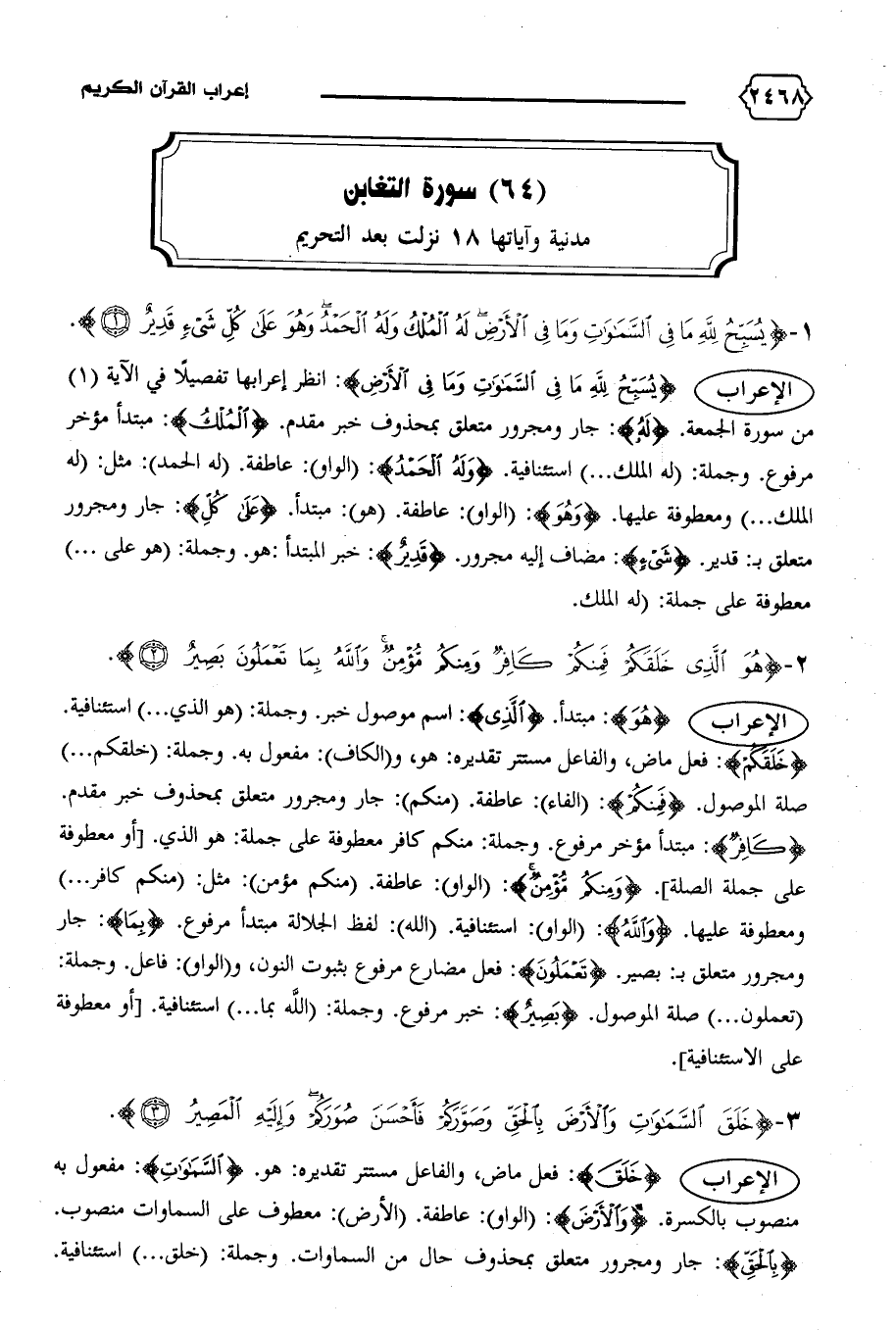 الإعراب {يُسَبِّحُ لِلّهِ ما فِي السَّماواتِ وَما فِي الْأَرْضِ}: انظر إعرابها تفصيلا في الآية (١) من سورة الجمعة. {لَهُ}: جار ومجرور متعلق بمحذوف خبر مقدم. {الْمُلْكُ}: مبتدأ مؤخر مرفوع. وجملة: (له الملك ... ) استئنافية. {وَلَهُ الْحَمْدُ}: (الواو): عاطفة. (له الحمد): مثل: (له الملك ... ) ومعطوفة عليها. {وَهُوَ}: (الواو): عاطفة. (هو): مبتدأ. {عَلى كُلِّ}: جار ومجرور متعلق ب: قدير. {شَيْءٍ}: مضاف إليه مجرور. {قَدِيرٌ}: خبر المبتدأ: هو. وجملة: (هو على ... ) معطوفة على جملة: (له الملك.