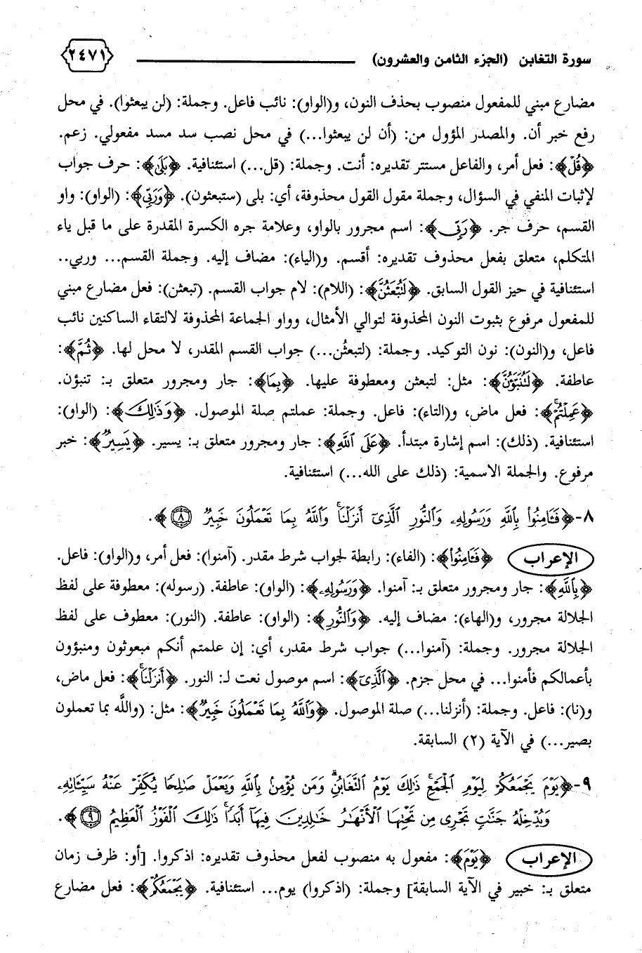 {بِاللهِ}: جار ومجرور متعلق ب: آمنوا. {وَرَسُولِهِ}: (الواو): عاطفة. (رسوله): معطوفة على لفظ الجلالة مجرور، و (الهاء): مضاف إليه. {وَالنُّورِ}: (الواو): عاطفة. (النور): معطوف على لفظ الجلالة مجرور. وجملة: (آمنوا ... ) جواب شرط مقدر، أي: إن علمتم أنكم مبعوثون ومنبئون بأعمالكم فأمنوا ... في محل جزم. {الَّذِي}: اسم موصول نعت ل: النور. {أَنْزَلْنا}: فعل ماض، و (نا): فاعل. وجملة: (أنزلنا ... ) صلة الموصول. {وَاللهُ بِما تَعْمَلُونَ خَبِيرٌ}: مثل: (والله بما تعملون بصير ... ) في الآية (٢) السابقة.