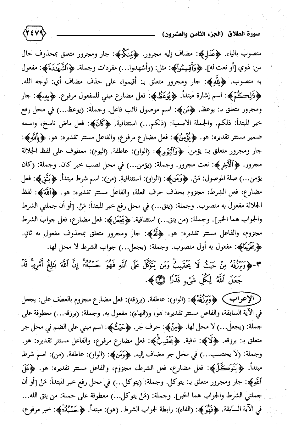 وجملة: (لا يحتسب ... ) في محل جر مضاف إليه. {وَمَنْ}: (الواو): عاطفة. (من): اسم شرط مبتدأ. {يَتَوَكَّلْ}: فعل مضارع، فعل الشرط، مجزوم، والفاعل مستتر تقديره: هو. {عَلَى اللهِ}: جار ومجرور متعلق ب: يتوكل. وجملة: (يتوكل ... ) في محل رفع خبر المبتدأ: من [أو أن جملتي الشرط والجواب هما الخبر].وجملة: (من يتوكل ... ) معطوفة على جملة: من يتق الله