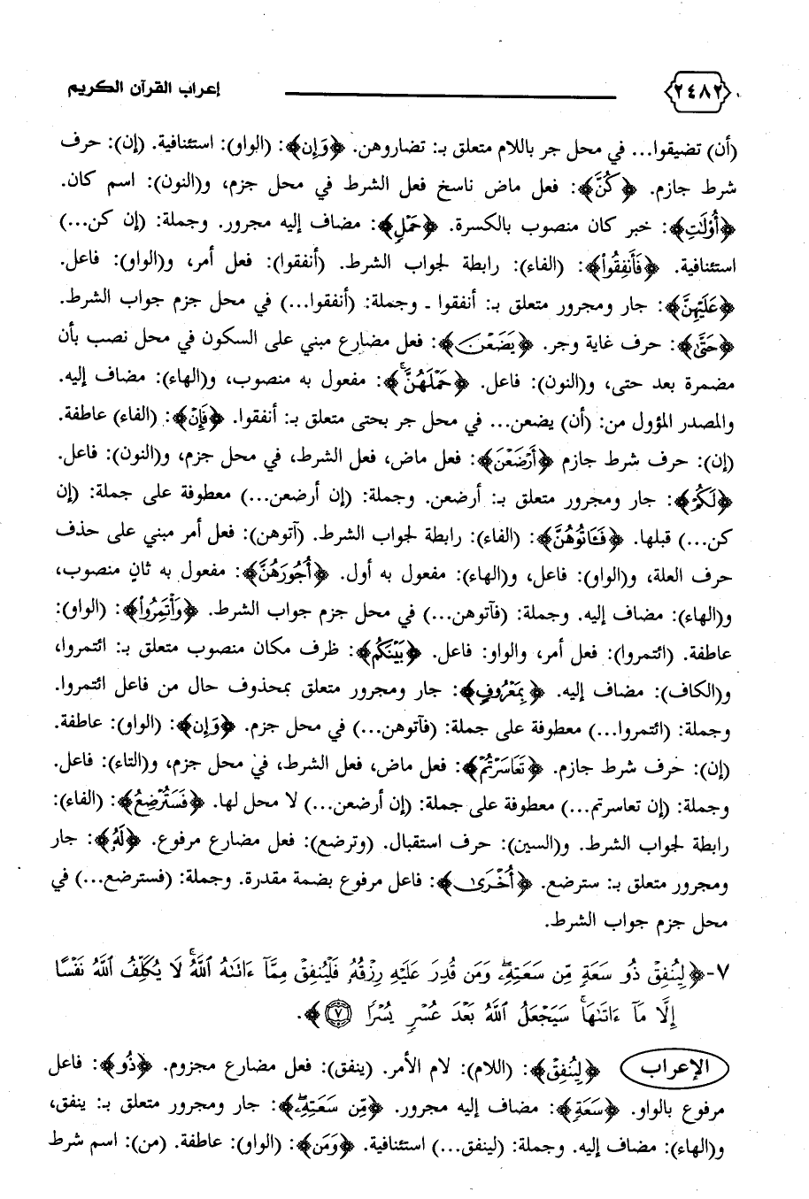 الإعراب {لِيُنْفِقْ}: (اللام): لام الأمر. (ينفق): فعل مضارع مجزوم. {ذُو}: فاعل مرفوع بالواو. {سَعَةٍ}: مضاف إليه مجرور. {مِنْ سَعَتِهِ}: جار ومجرور متعلق ب‍: ينفق، و (الهاء): مضاف إليه. وجملة: (لينفق ... ) استئنافية. {وَمَنْ}: (الواو): عاطفة. (من): اسم شرط