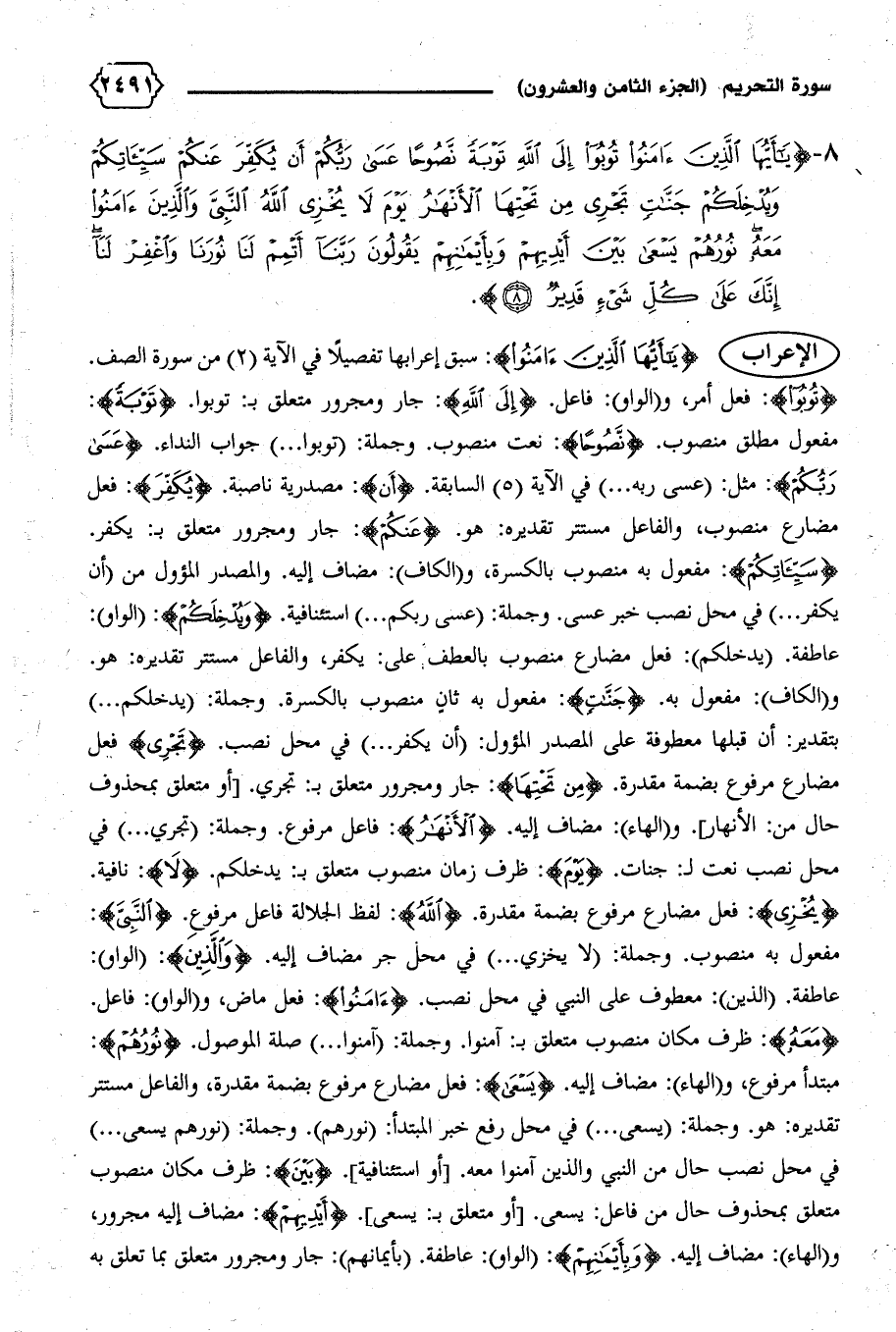 مفعول مطلق منصوب. {نَصُوحاً}: نعت منصوب. وجملة: (توبوا ... ) جواب النداء. {عَسى رَبُّكُمْ}: مثل: (عسى ربه ... ) في الآية (٥) السابقة. {أَنْ}: مصدرية ناصبة. {يُكَفِّرَ}: فعل مضارع منصوب، والفاعل مستتر تقديره: هو. {عَنْكُمْ}: جار ومجرور متعلق ب: يكفر.