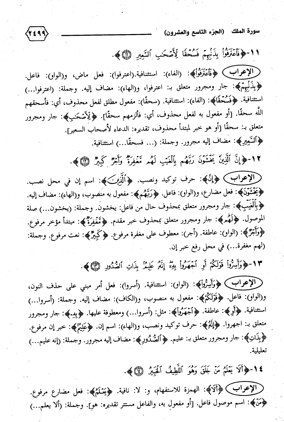 {بِذَنْبِهِمْ}: جار ومجرور متعلق ب: اعترفوا، و (الهاء): مضاف إليه. وجملة: (اعترفوا ... ) استئنافية. {فَسُحْقاً}: (الفاء): استئنافية. (سحقا): مفعول مطلق لفعل محذوف، أي: فأسحقهم الله سحقا. [أو مفعول به لفعل محذوف، أي: فألزمهم سحقا]. {لِأَصْحابِ}: جار ومجرور متعلق ب: سحقا [أو هو خبر لمبتدإ محذوف، تقديره: الدعاء لأصحاب السعير].
