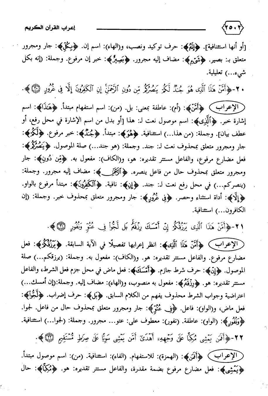 الإعراب {أَمَّنْ}: (أم): عاطفة بمعنى: بل. (من): اسم استفهام مبتدأ. {هذَا}: اسم إشارة خبر. {الَّذِي}: اسم موصول نعت ل: هذا [أو بدل من اسم الإشارة في محل رفع، أو عطف بيان].وجملة: (من هذا ... ) استئنافية. {هُوَ}: مبتدأ. {جُنْدٌ}: خبر مرفوع. {لَكُمْ}: