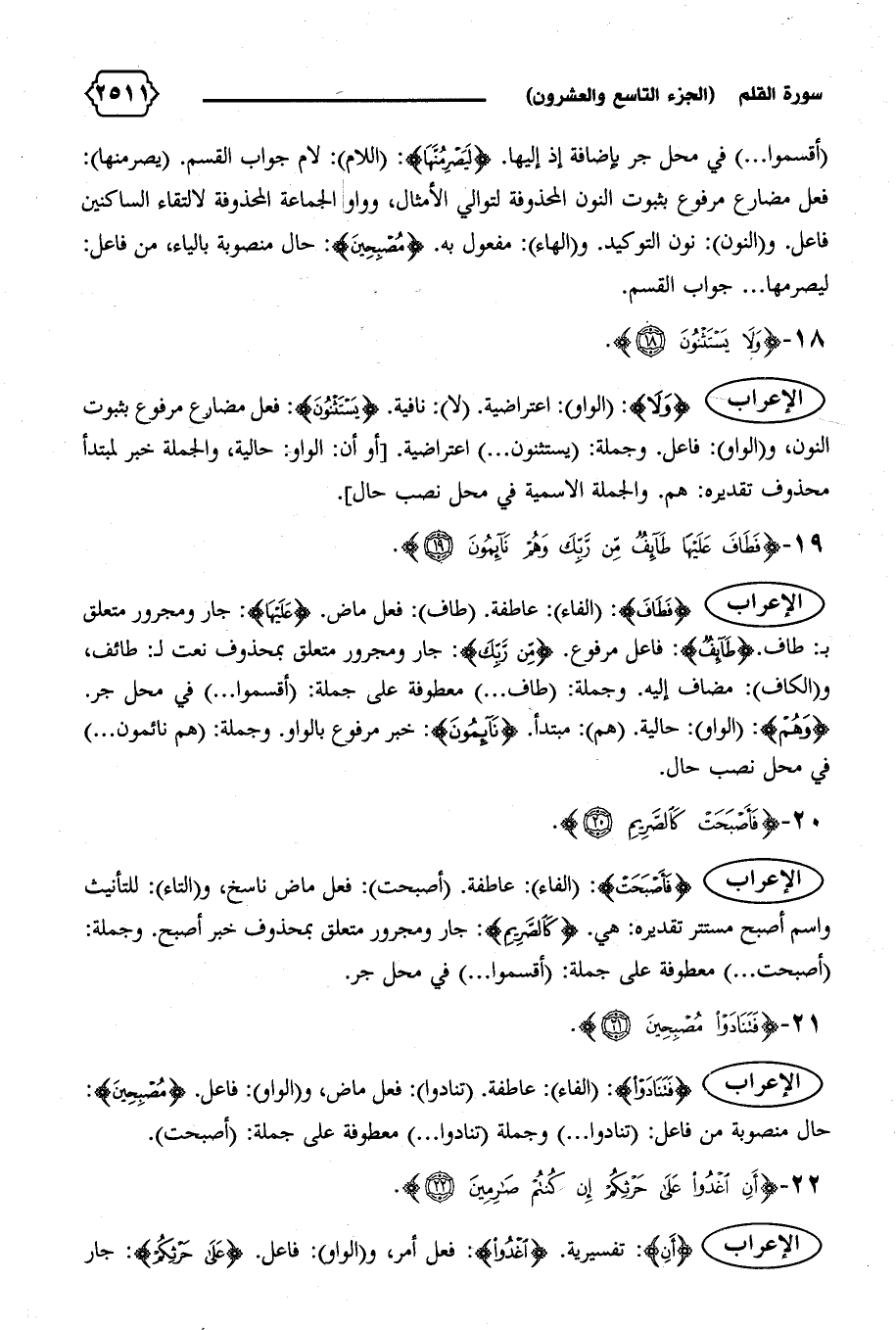 الإعراب {فَأَصْبَحَتْ}: (الفاء): عاطفة. (أصبحت): فعل ماض ناسخ، و (التاء): للتأنيث واسم أصبح مستتر تقديره: هي. {كَالصَّرِيمِ}: جار ومجرور متعلق بمحذوف خبر أصبح. وجملة: