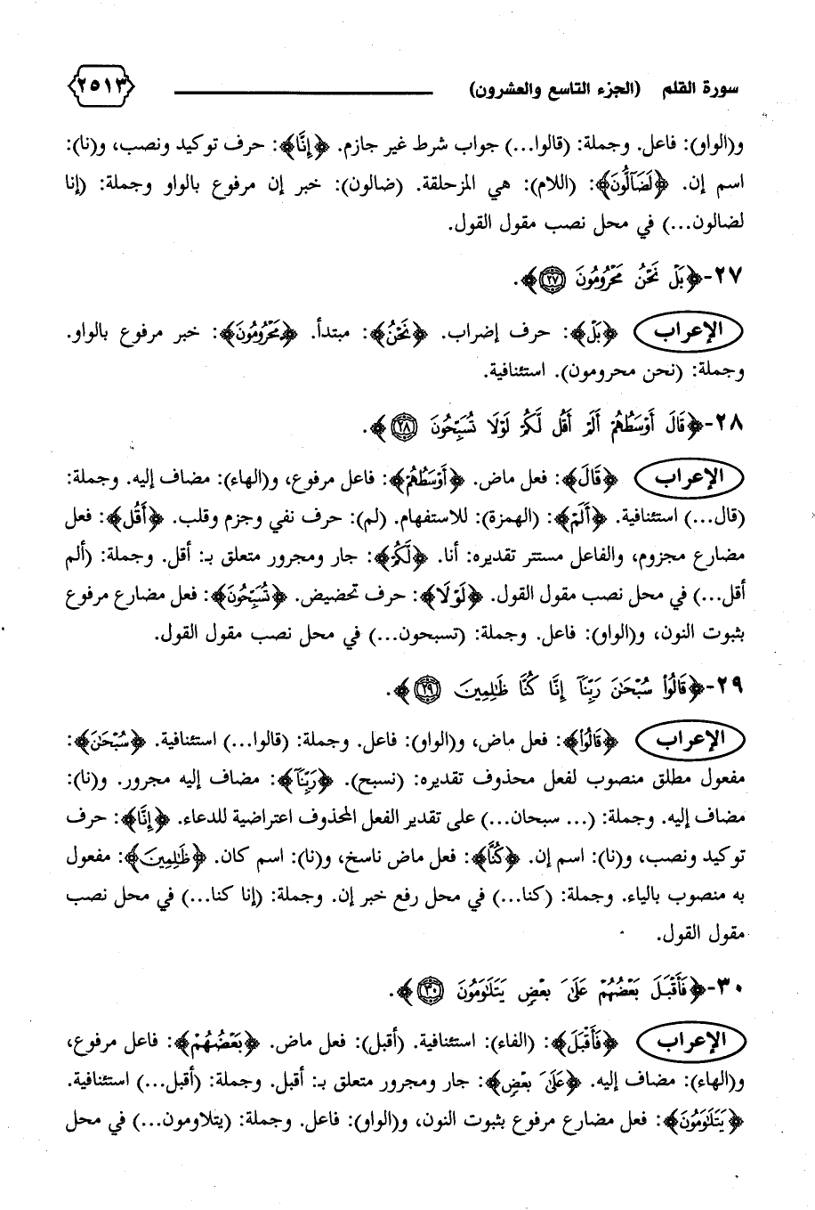 مضاف إليه. وجملة: ( ... سبحان ... ) على تقدير الفعل المحذوف اعتراضية للدعاء. {إِنّا}: حرف توكيد ونصب، و (نا): اسم إن. {كُنّا}: فعل ماض ناسخ، و (نا): اسم كان. {ظالِمِينَ}: مفعول به منصوب بالياء. وجملة: (كنا ... ) في محل رفع خبر إن. وجملة: (إنا كنا ... ) في محل نصب مقول القول.