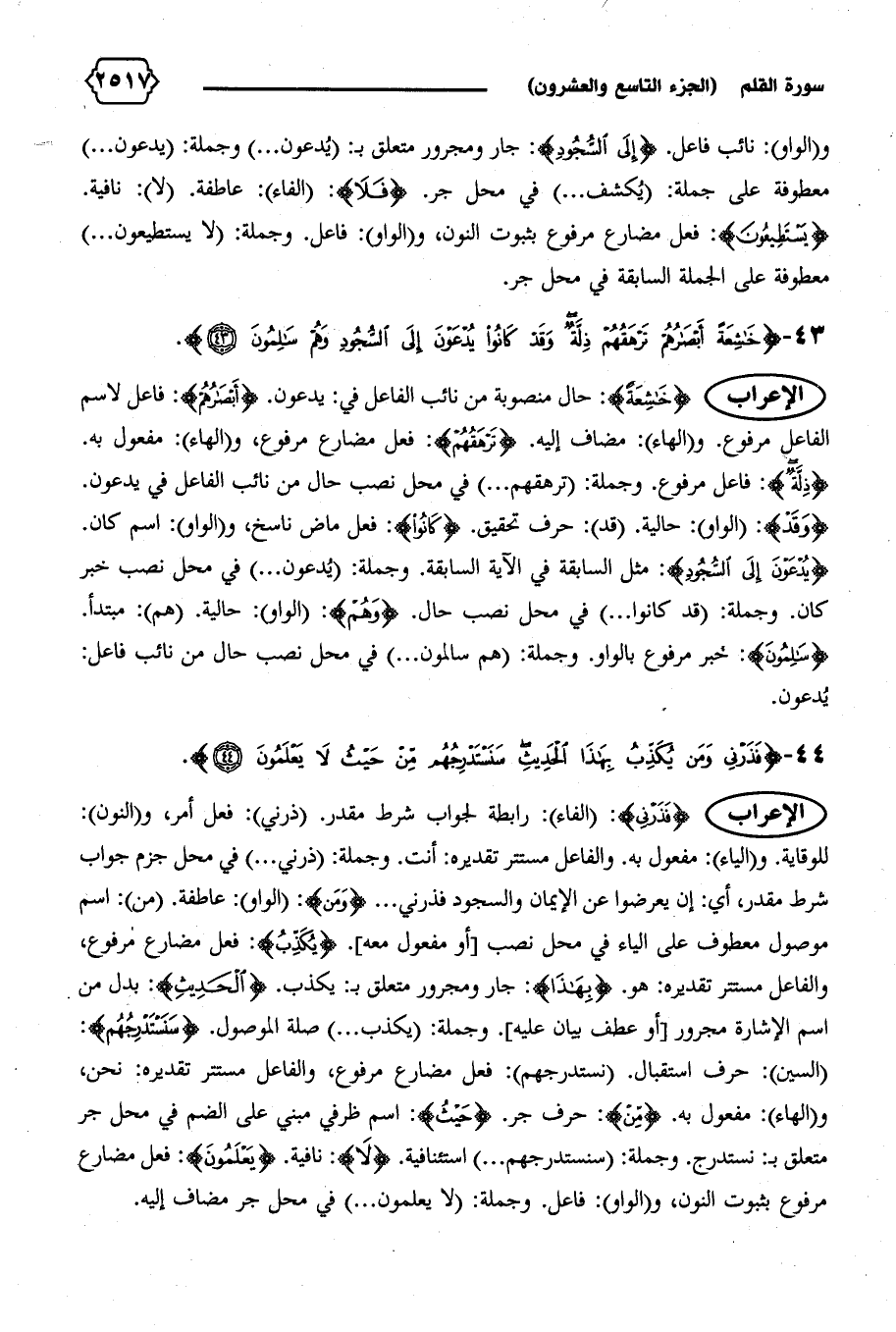 الإعراب {خاشِعَةً}: حال منصوبة من نائب الفاعل في: يدعون. {أَبْصارُهُمْ}: فاعل لاسم الفاعل مرفوع. و (الهاء): مضاف إليه. {تَرْهَقُهُمْ}: فعل مضارع مرفوع، و (الهاء): مفعول به.