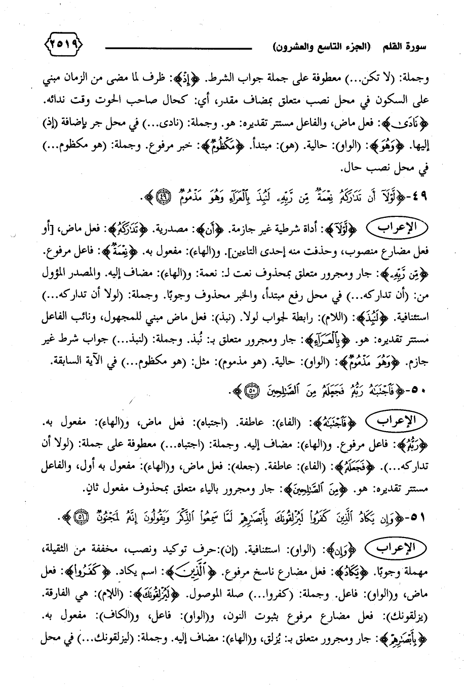 {مِنْ رَبِّهِ}: جار ومجرور متعلق بمحذوف نعت ل: نعمة: و (الهاء): مضاف إليه. والمصدر المؤول من: (أن تداركه ... ) في محل رفع مبتدأ، والخبر محذوف وجوبا. وجملة: (لولا أن تداركه ... ) استئنافية. {لَنُبِذَ}: (اللام): رابطة لجواب لولا. (نبذ): فعل ماض مبني للمجهول، ونائب الفاعل مستتر تقديره: هو. {بِالْعَراءِ}: جار ومجرور متعلق ب: نبذ. وجملة: (لنبذ ... ) جواب شرط غير جازم. {وَهُوَ مَذْمُومٌ}: (الواو): حالية. (هو مذموم): مثل: (هو مكظوم ... ) في الآية السابقة.