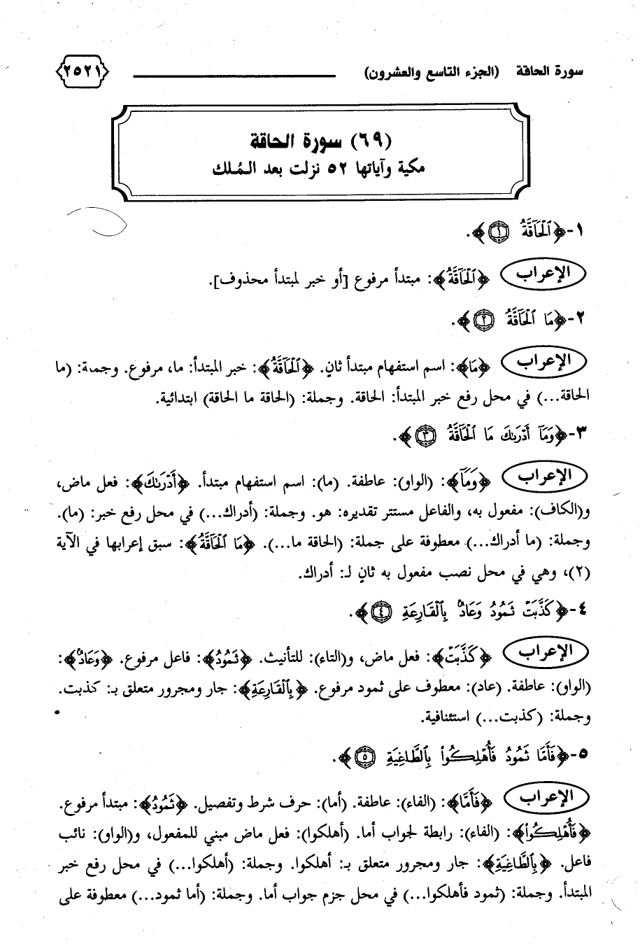 الإعراب {مَا}: اسم استفهام مبتدأ ثان. {الْحَاقَّةُ}: خبر المبتدأ: ما، مرفوع. وجملة: (ما الحاقة ... ) في محل رفع خبر المبتدأ: الحاقة. وجملة: (الحاقة ما الحاقة) ابتدائية.