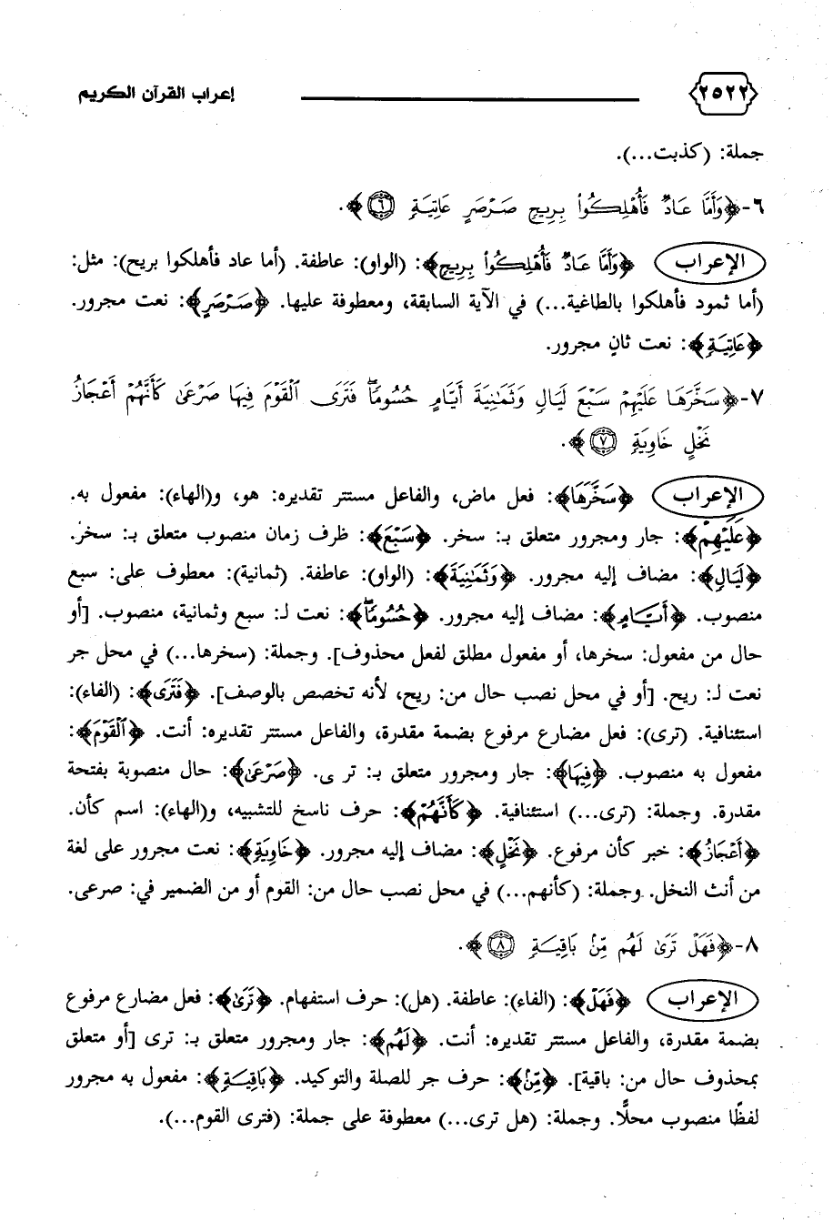 {لَيالٍ}: مضاف إليه مجرور. {وَثَمانِيَةَ}: (الواو): عاطفة. (ثمانية): معطوف على: سبع منصوب. {أَيّامٍ}: مضاف إليه مجرور. {حُسُوماً}: نعت ل: سبع وثمانية، منصوب. [أو حال من مفعول: سخرها، أو مفعول مطلق لفعل محذوف].وجملة: (سخرها ... ) في محل جر نعت ل: ريح. [أو في محل نصب حال من: ريح، لأنه تخصص بالوصف]. {فَتَرَى}: (الفاء):