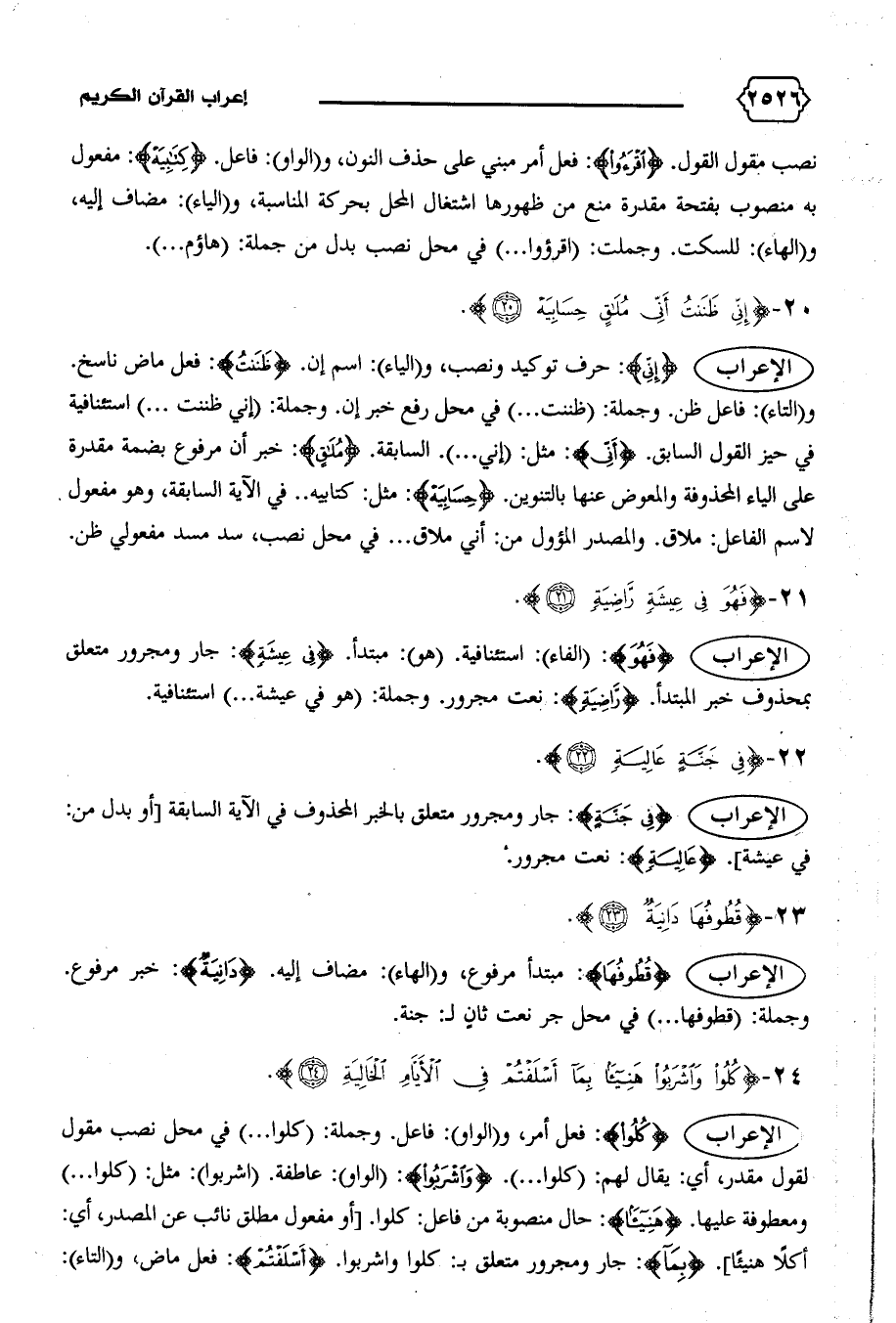 و (التاء): فاعل ظن. وجملة: (ظننت ... ) في محل رفع خبر إن. وجملة: (إني ظننت ... ) استئنافية في حيز القول السابق. {إِنِّي}: مثل: (إني ... ).السابقة. {مُلاقٍ}: خبر أن مرفوع بضمة مقدرة على الياء المحذوفة والمعوض عنها بالتنوين. {حِسابِيَهْ}: مثل: كتابيه ... في الآية السابقة، وهو مفعول لاسم الفاعل: ملاق. والمصدر المؤول من: أني ملاق ... في محل نصب، سد مسد مفعولي ظن.