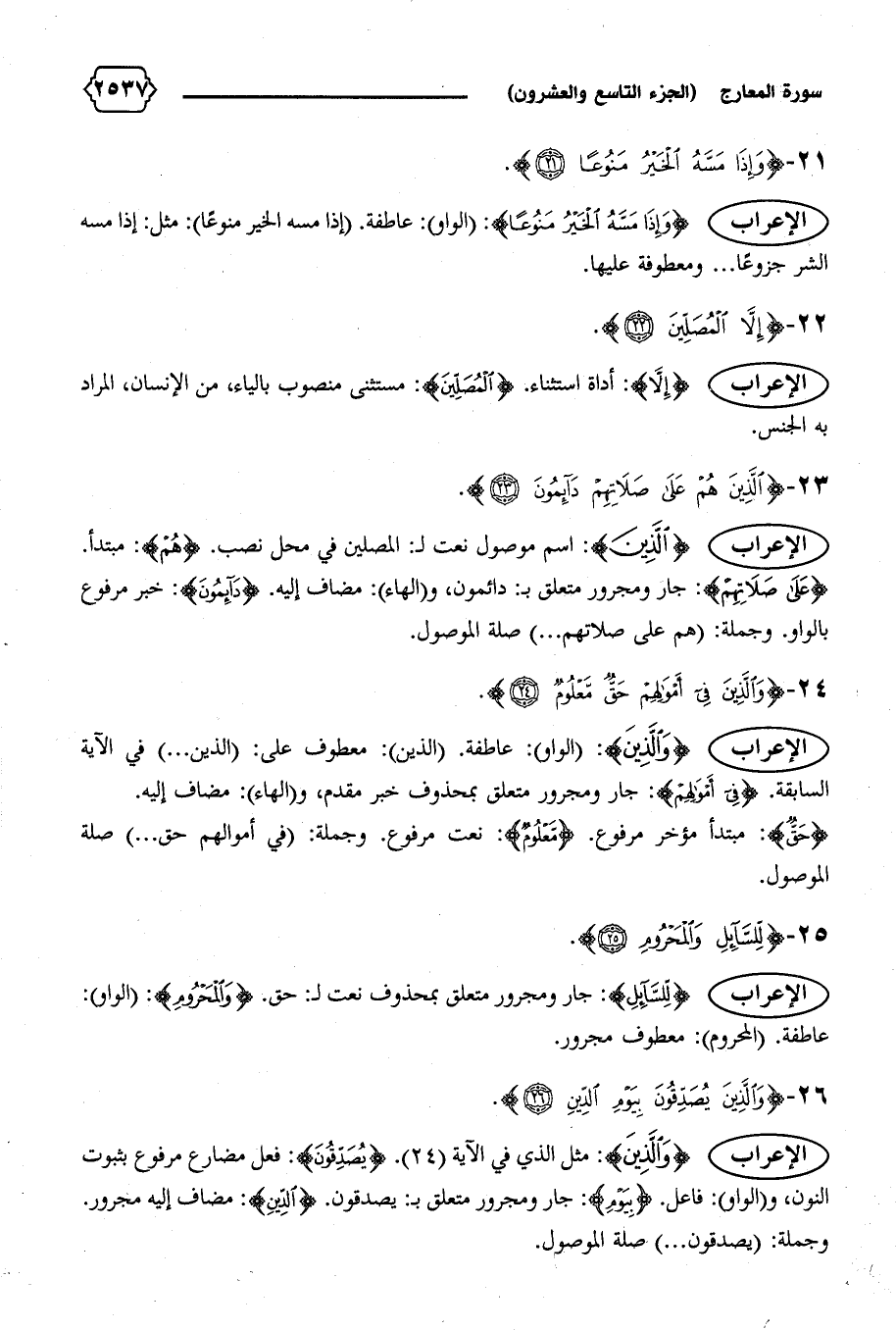 الإعراب {إِلَاّ}: أداة استثناء. {الْمُصَلِّينَ}: مستثنى منصوب بالياء، من الإنسان، المراد به الجنس.