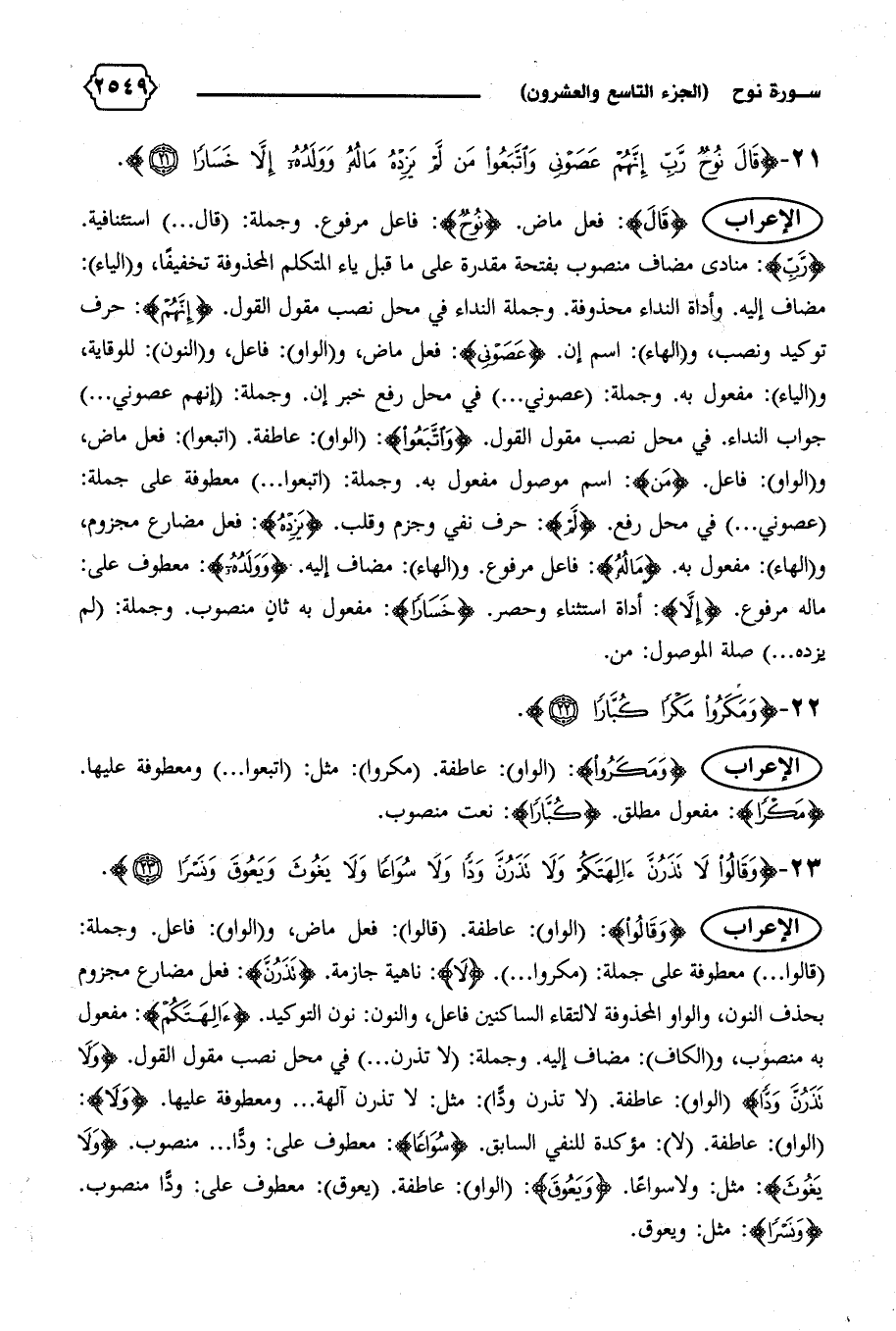 مضاف إليه. وأداة النداء محذوفة. وجملة النداء في محل نصب مقول القول. {إِنَّهُمْ}: حرف توكيد ونصب، و (الهاء): اسم إن. {عَصَوْنِي}: فعل ماض، و (الواو): فاعل، و (النون): للوقاية، و (الياء): مفعول به. وجملة: (عصوني ... ) في محل رفع خبر إن. وجملة: (إنهم عصوني ... ) جواب النداء. في محل نصب مقول القول. {وَاتَّبَعُوا}: (الواو): عاطفة. (اتبعوا): فعل ماض، و (الواو): فاعل. {مَنْ}: اسم موصول مفعول به. وجملة: (اتبعوا ... ) معطوفة على جملة: