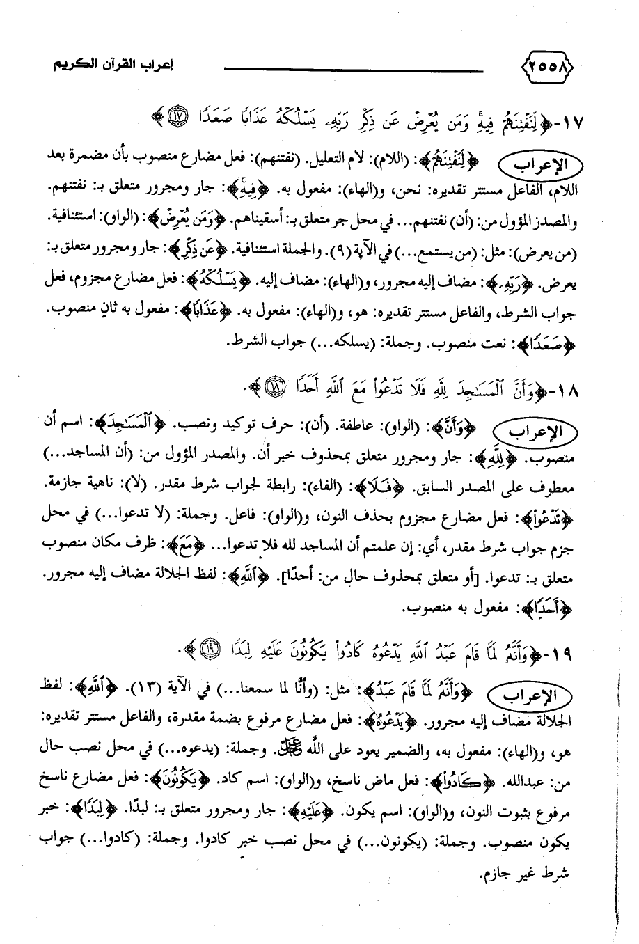الإعراب {وَأَنَّ}: (الواو): عاطفة. (أن): حرف توكيد ونصب. {الْمَساجِدَ}: اسم أن منصوب. {لِلّهِ}: جار ومجرور متعلق بمحذوف خبر أن. والمصدر المؤول من: (أن المساجد ... ) معطوف على المصدر السابق. {فَلا}: (الفاء): رابطة لجواب شرط مقدر. (لا): ناهية جازمة.