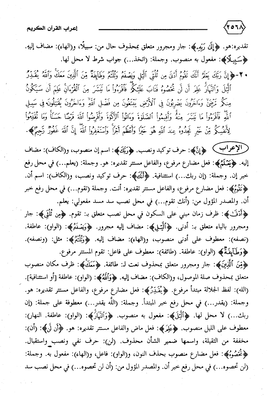 ٢٠ - {إِنَّ رَبَّكَ يَعْلَمُ أَنَّكَ تَقُومُ أَدْنى مِنْ ثُلُثَيِ اللَّيْلِ وَنِصْفَهُ وَثُلُثَهُ وَطائِفَةٌ مِنَ الَّذِينَ مَعَكَ وَاللهُ يُقَدِّرُ اللَّيْلَ وَالنَّهارَ عَلِمَ أَنْ لَنْ تُحْصُوهُ فَتابَ عَلَيْكُمْ فَاقْرَؤُا ما تَيَسَّرَ مِنَ الْقُرْآنِ عَلِمَ أَنْ سَيَكُونُ مِنْكُمْ مَرْضى وَآخَرُونَ يَضْرِبُونَ فِي الْأَرْضِ يَبْتَغُونَ مِنْ فَضْلِ اللهِ وَآخَرُونَ يُقاتِلُونَ فِي سَبِيلِ اللهِ فَاقْرَؤُا ما تَيَسَّرَ مِنْهُ وَأَقِيمُوا الصَّلاةَ وَآتُوا الزَّكاةَ وَأَقْرِضُوا اللهَ قَرْضاً حَسَناً وَما تُقَدِّمُوا لِأَنْفُسِكُمْ مِنْ خَيْرٍ تَجِدُوهُ عِنْدَ اللهِ هُوَ خَيْراً وَأَعْظَمَ أَجْراً وَاِسْتَغْفِرُوا اللهَ إِنَّ اللهَ غَفُورٌ رَحِيمٌ (٢٠)}