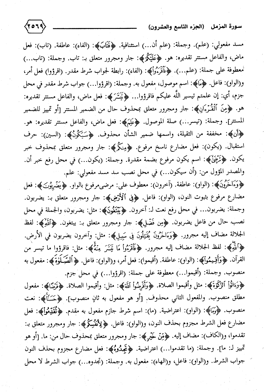 مسد مفعولي: (علم).وجملة: (علم أن ... ) استئنافية. {فَتابَ}: (الفاء): عاطفة. (تاب): فعل ماض، والفاعل مستتر تقديره: هو. {عَلَيْكُمْ}: جار ومجرور متعلق ب: تاب. وجملة: (تاب ... ) معطوفة على جملة: (علم ... ). {فَاقْرَؤُا}: (الفاء): رابطة لجواب شرط مقدر. (اقرءوا) فعل أمر، و (الواو): فاعل. {ما}: اسم موصول، مفعول به. وجملة: (اقرءوا ... ) جواب شرط مقدر في محل جزم، أي: إن علمتم تيسير الله عليكم فاقرءوا ... {تَيَسَّرَ}: فعل ماض، والفاعل مستتر تقديره: