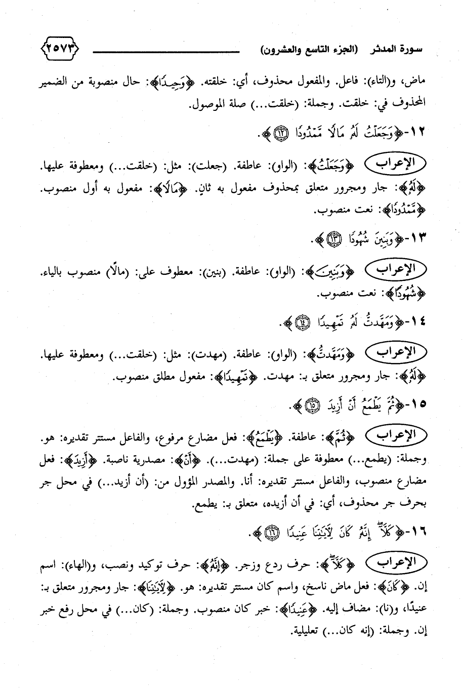 الإعراب {كَلاّ}: حرف ردع وزجر. {إِنَّهُ}: حرف توكيد ونصب، و (الهاء): اسم إن. {كانَ}: فعل ماض ناسخ، واسم كان مستتر تقديره: هو. {لِآياتِنا}: جار ومجرور متعلق ب:
