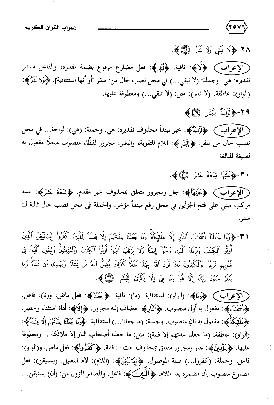 الإعراب {لَوّاحَةٌ}: خبر لمبتدإ محذوف تقديره: هي. وجملة: (هي): لواحة ... في محل نصب حال من سقر. {لِلْبَشَرِ}: اللام للتقوية، والبشر: مجرور لفظا، منصوب محلاّ مفعول به لصيغة المبالغة.