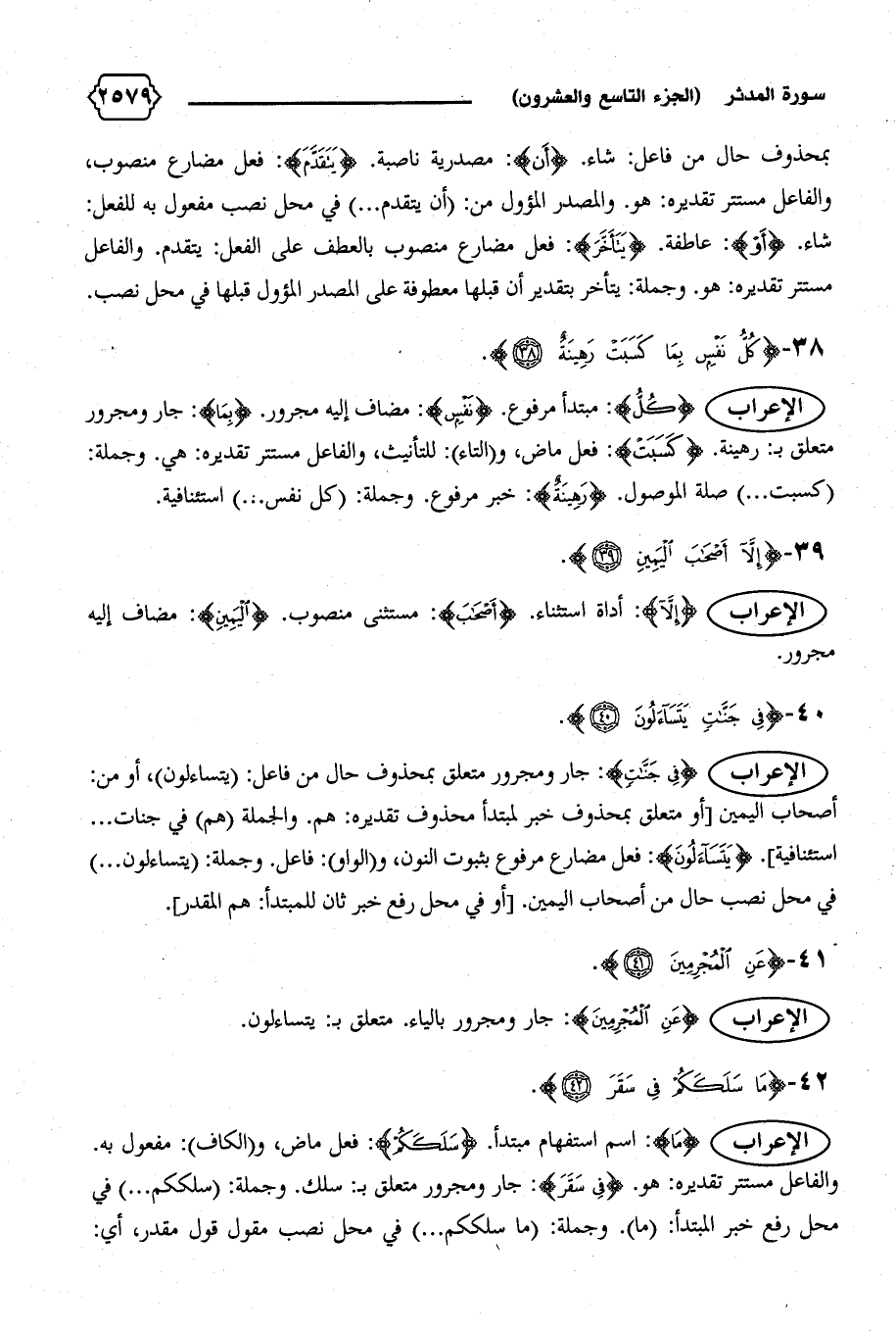 استئنافية]. {يَتَساءَلُونَ}: فعل مضارع مرفوع بثبوت النون، و (الواو): فاعل. وجملة: (يتساءلون ... ) في محل نصب حال من أصحاب اليمين. [أو في محل رفع خبر ثان للمبتدإ: هم المقدر].