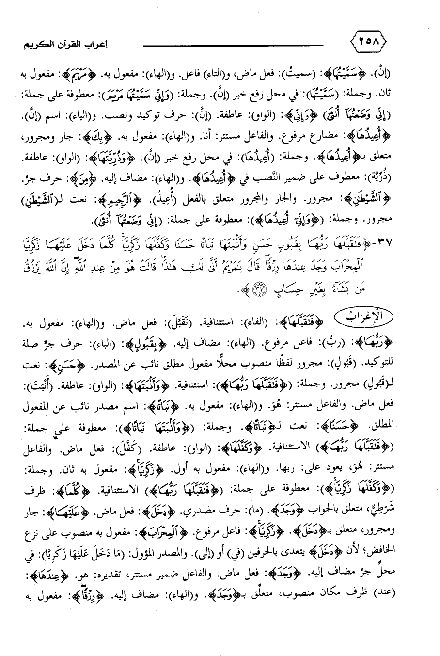 {رَبُّها}: (ربّ): فاعل مرفوع. (الهاء): مضاف إليه. {بِقَبُولٍ}: (الباء): حرف جرّ صلة للتوكيد. (قبول): مجرور لفظا منصوب محلاّ مفعول مطلق نائب عن المصدر. {حَسَنٍ}: نعت ل (قبول) مجرور. وجملة: {فَتَقَبَّلَها رَبُّها}: استئنافية. {وَأَنْبَتَها}: (الواو): عاطفة. (أنبت):