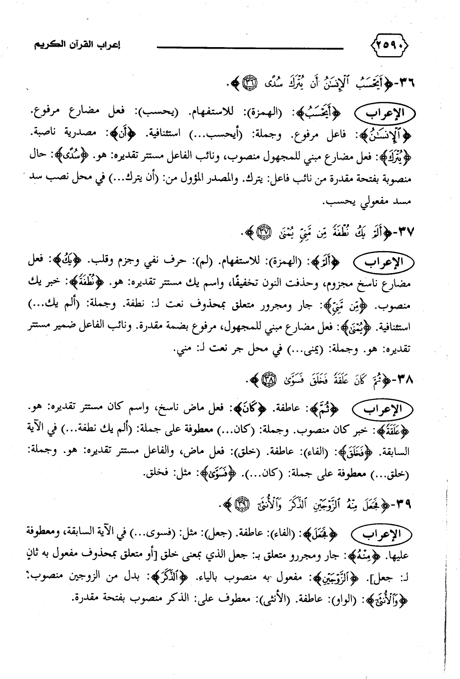 الإعراب {أَلَمْ}: (الهمزة): للاستفهام. (لم): حرف نفي وجزم وقلب. {يَكُ}: فعل مضارع ناسخ مجزوم، وحذفت النون تخفيفا، واسم يك مستتر تقديره: هو. {نُطْفَةً}: خبر يك منصوب. {مِنْ مَنِيٍّ}: جار ومجرور متعلق بمحذوف نعت ل: نطفة. وجملة: (ألم يك ... ) استئنافية. {يُمْنى}: فعل مضارع مبني للمجهول، مرفوع بضمة مقدرة. ونائب الفاعل ضمير مستتر تقديره: هو. وجملة: (يمنى ... ) في محل جر نعت ل: مني.