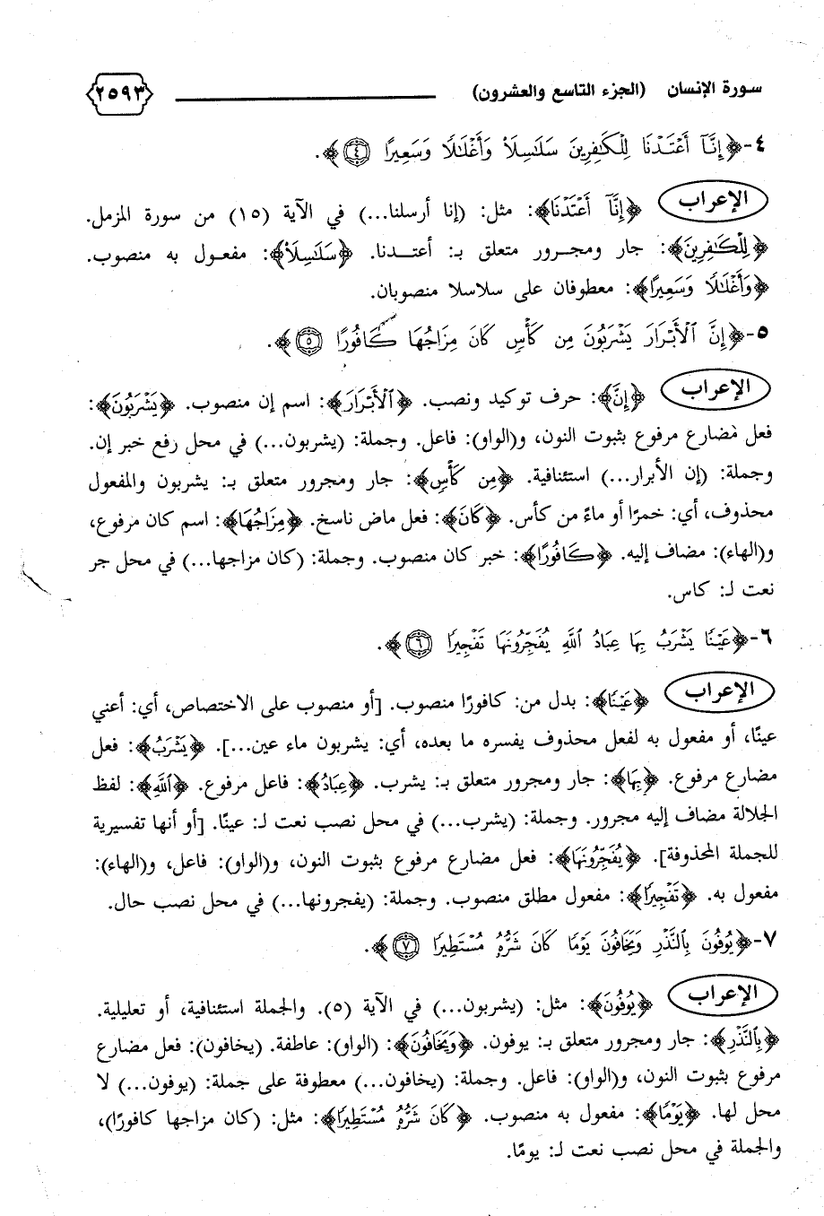 الإعراب {عَيْناً}: بدل من: كافورا منصوب. [أو منصوب على الاختصاص، أي: أعني عينا، أو مفعول به لفعل محذوف يفسره ما بعده، أي: يشربون ماء عين ... ]. {يَشْرَبُ}: فعل مضارع مرفوع. {بِها}: جار ومجرور متعلق ب: يشرب. {عِبادُ}: فاعل مرفوع. {اللهِ}: لفظ الجلالة مضاف إليه مجرور. وجملة: (يشرب ... ) في محل نصب نعت ل: عينا. [أو أنها تفسيرية للجملة المحذوفة]. {يُفَجِّرُونَها}: فعل مضارع مرفوع بثبوت النون، و (الواو): فاعل، و (الهاء):
