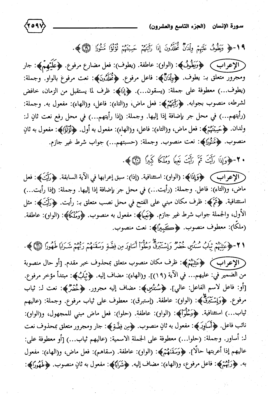 الإعراب {عالِيَهُمْ}: ظرف مكان منصوب متعلق بمحذوف خبر مقدم. [أو حال منصوبة من الضمير في: عليهم ... في الآية (١٩)].و (الهاء): مضاف إليه. {ثِيابُ}: مبتدأ مؤخر مرفوع.