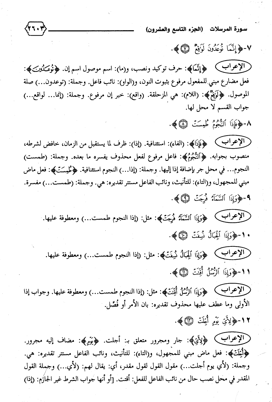 الإعراب {وَإِذَا الرُّسُلُ أُقِّتَتْ}: مثل: (إذا النجوم طمست ... ) ومعطوفة عليها. وجواب إذا الأولى وما عطف عليها محذوف تقديره: بان الأمر أو فصّل.
