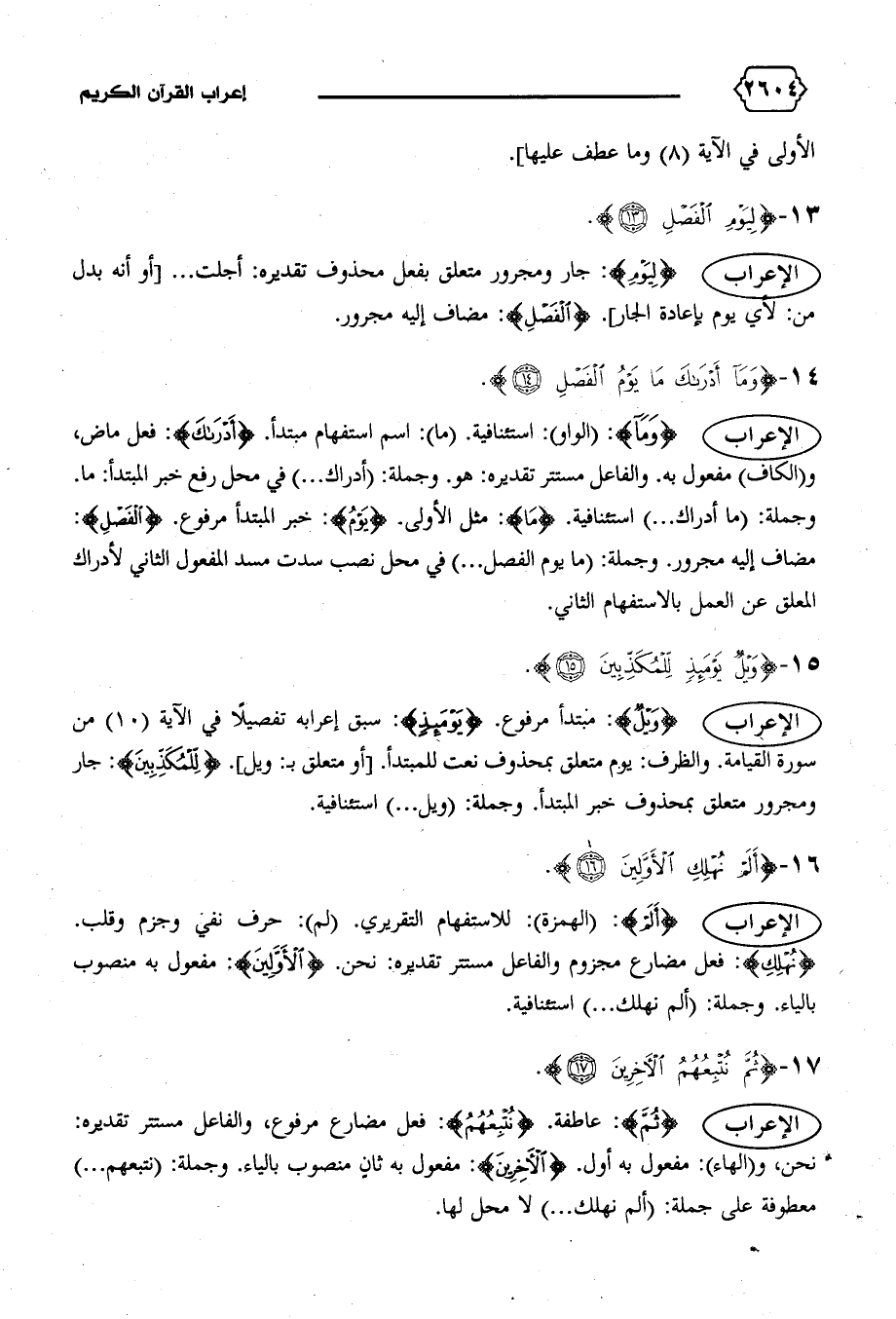 الإعراب {وَيْلٌ}: مبتدأ مرفوع. {يَوْمَئِذٍ}: سبق إعرابه تفصيلا في الآية (١٠) من سورة القيامة. والظرف: يوم متعلق بمحذوف نعت للمبتدإ. [أو متعلق ب: ويل]. {لِلْمُكَذِّبِينَ}: جار ومجرور متعلق بمحذوف خبر المبتدأ. وجملة: (ويل ... ) استئنافية.