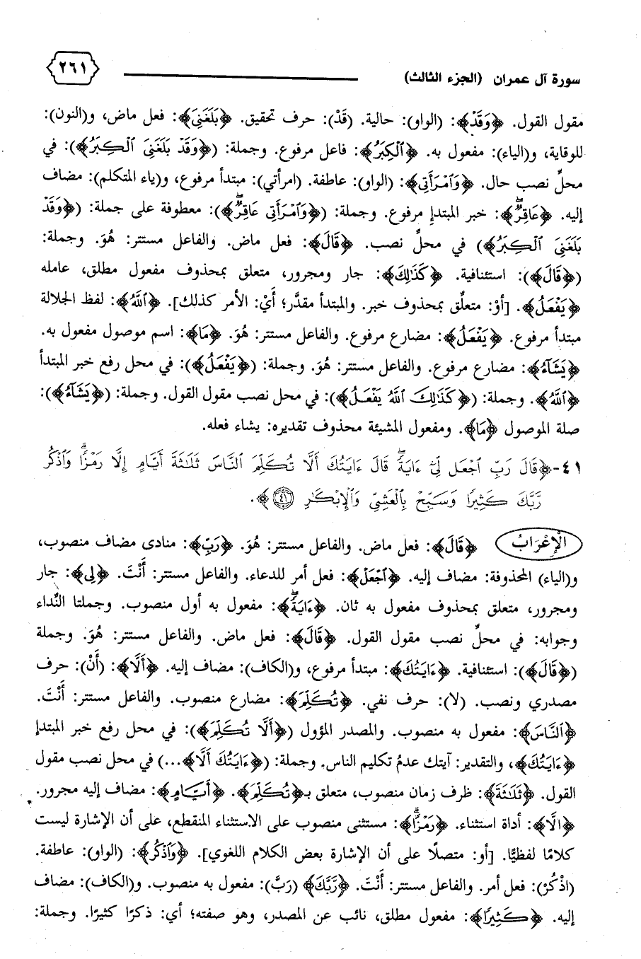 {قالَ}: فعل ماض. والفاعل مستتر: هو. {رَبِّ}: منادى مضاف منصوب، و (الياء) المحذوفة: مضاف إليه. {اِجْعَلْ}: فعل أمر للدعاء. والفاعل مستتر: أنت. {لِي}: جار ومجرور، متعلق بمحذوف مفعول به ثان. {آيَةً}: مفعول به أول منصوب. وجملتا النّداء وجوابه: في محلّ نصب مقول القول. {قالَ}: فعل ماض. والفاعل مستتر: هو. وجملة {قالَ}: استئنافية. {آيَتُكَ}: مبتدأ مرفوع، و (الكاف): مضاف إليه. {أَلاّ}: (أن): حرف مصدري ونصب. (لا): حرف نفي. {تُكَلِّمَ}: مضارع منصوب. والفاعل مستتر: أنت.