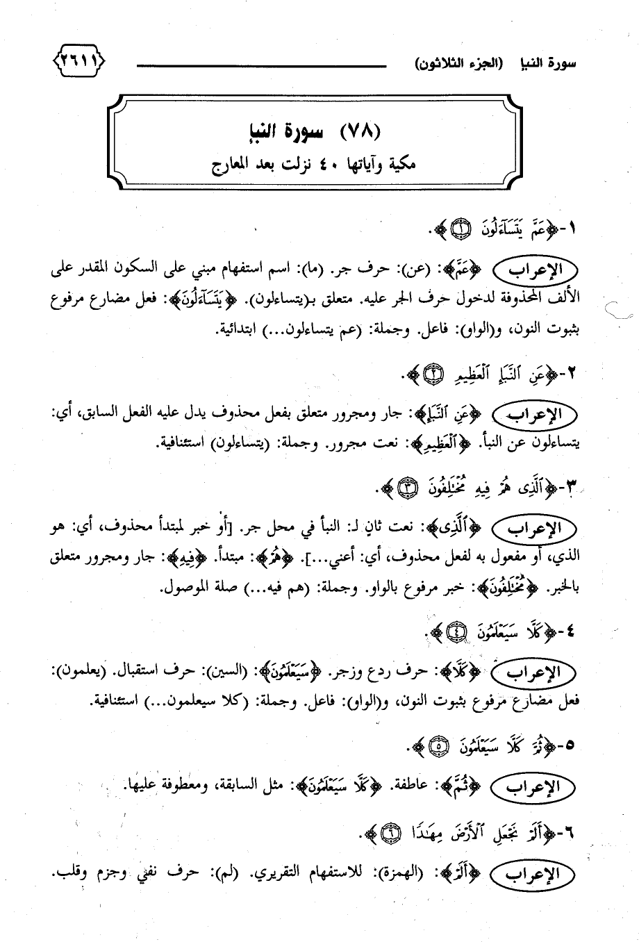 الإعراب {عَمَّ}: (عن): حرف جر. (ما): اسم استفهام مبني على السكون المقدر على الألف المحذوفة لدخول حرف الجر عليه. متعلق ب (يتساءلون). {يَتَساءَلُونَ}: فعل مضارع مرفوع بثبوت النون، و (الواو): فاعل. وجملة: (عم يتساءلون ... ) ابتدائية.