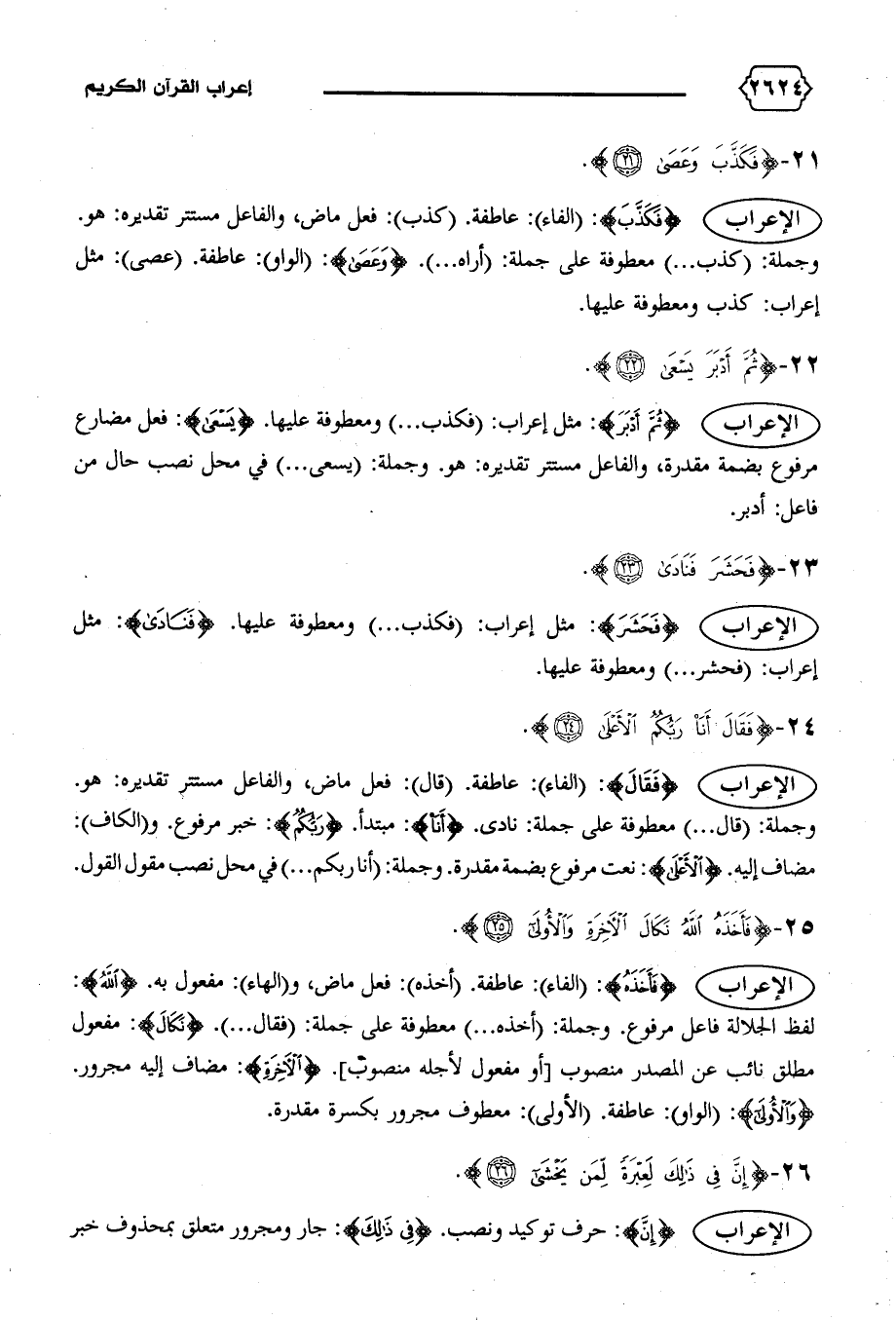 الإعراب {ثُمَّ أَدْبَرَ}: مثل إعراب: (فكذب ... ) ومعطوفة عليها. {يَسْعى}: فعل مضارع مرفوع بضمة مقدرة، والفاعل مستتر تقديره: هو. وجملة: (يسعى ... ) في محل نصب حال من فاعل: أدبر.