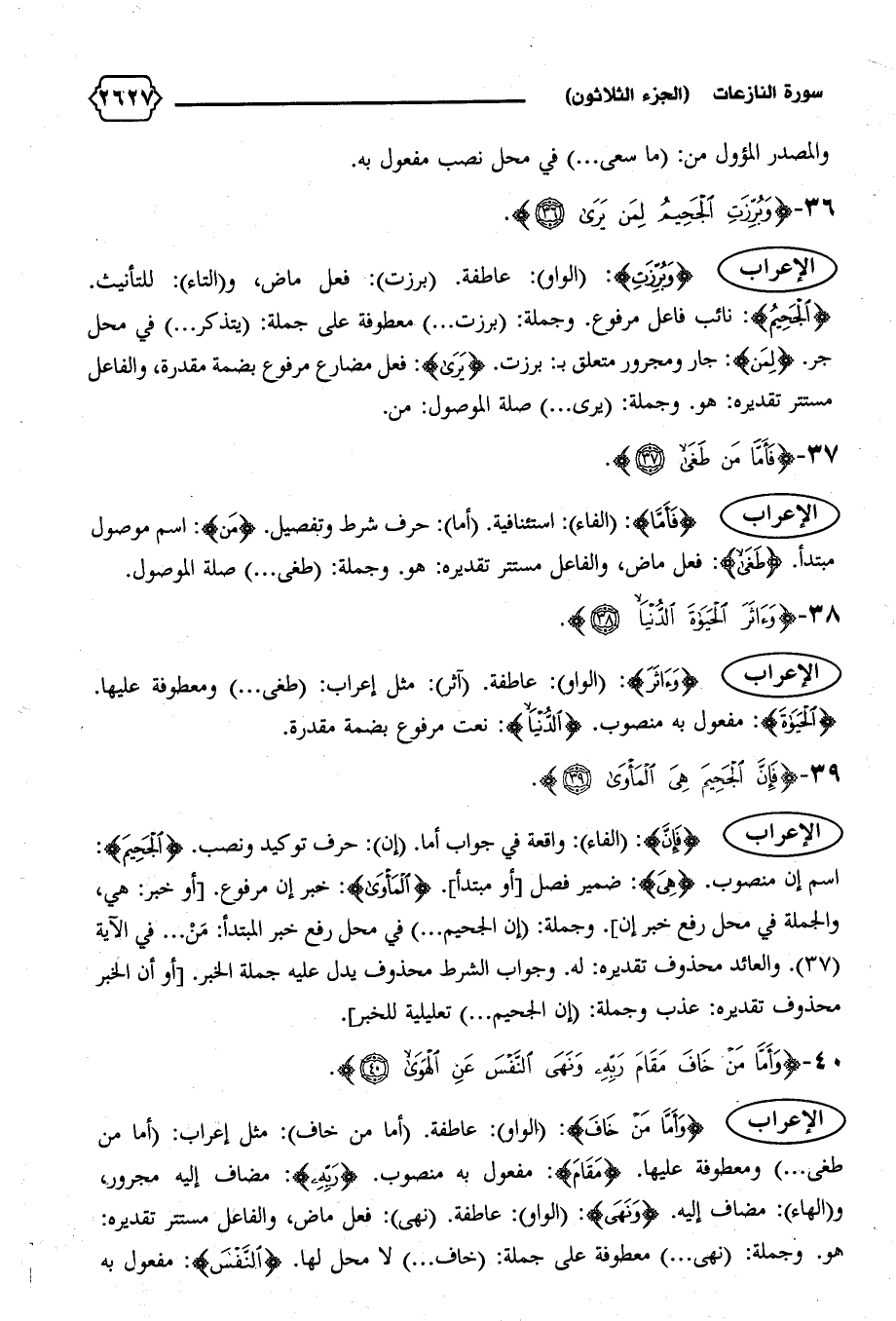 الإعراب {وَأَمّا مَنْ خافَ}: (الواو): عاطفة. (أما من خاف): مثل إعراب: (أما من طغى ... ) ومعطوفة عليها. {مَقامَ}: مفعول به منصوب. {رَبِّهِ}: مضاف إليه مجرور، و (الهاء): مضاف إليه. {وَنَهَى}: (الواو): عاطفة. (نهى): فعل ماض، والفاعل مستتر تقديره: