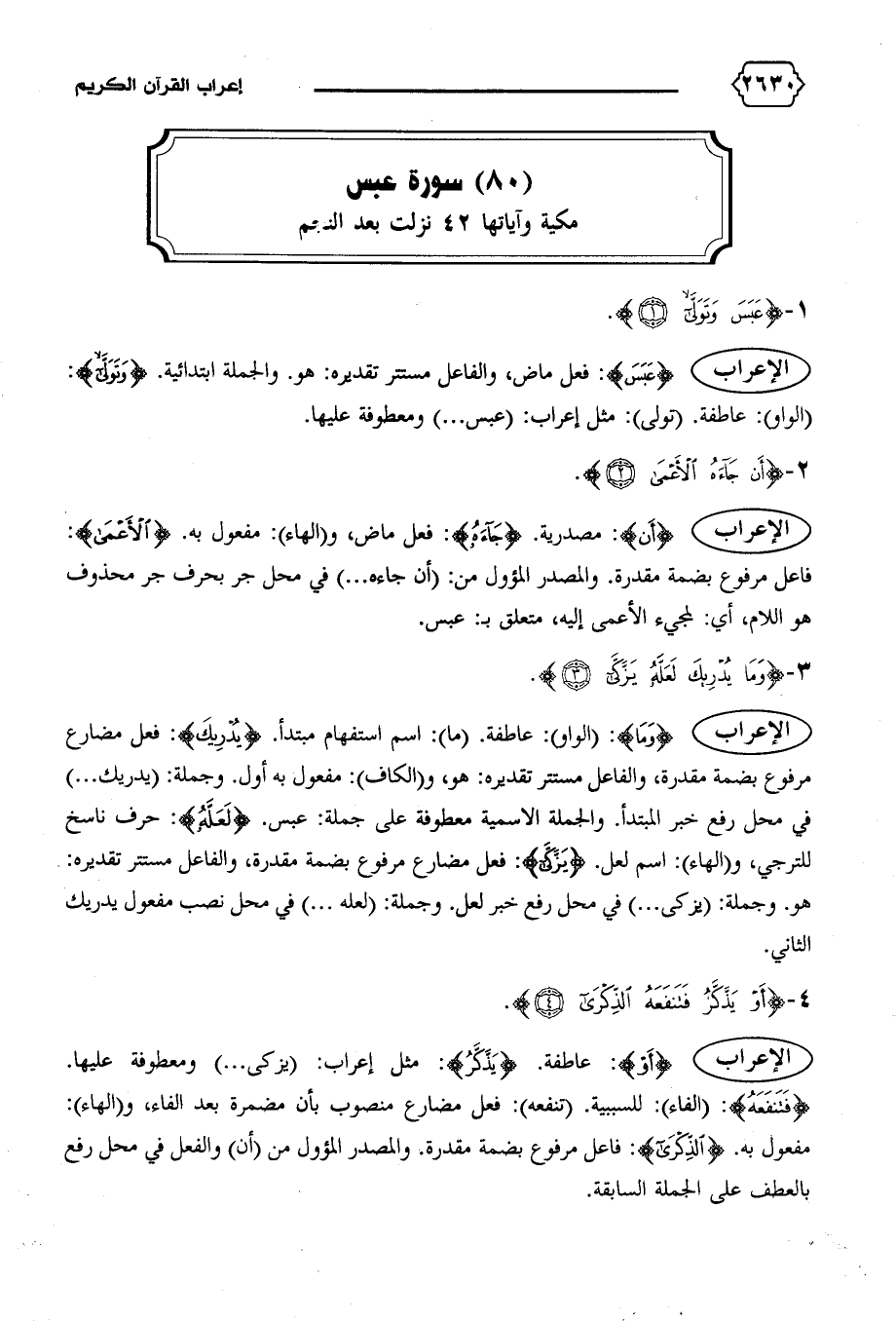 الإعراب {وَما}: (الواو): عاطفة. (ما): اسم استفهام مبتدأ. {يُدْرِيكَ}: فعل مضارع مرفوع بضمة مقدرة، والفاعل مستتر تقديره: هو، و (الكاف): مفعول به أول. وجملة: (يدريك ... ) في محل رفع خبر المبتدأ. والجملة الاسمية معطوفة على جملة: عبس. {لَعَلَّهُ}: حرف ناسخ للترجي، و (الهاء): اسم لعل. {يَزَّكّى}: فعل مضارع مرفوع بضمة مقدرة، والفاعل مستتر تقديره: