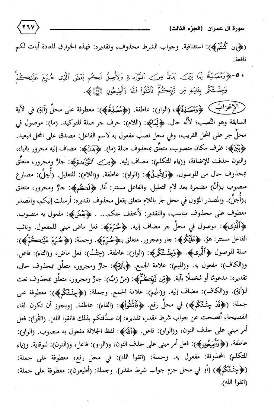 {بَيْنَ}: ظرف مكان منصوب، متعلّق بمحذوف صلة (ما). {يَدَيَّ}: مضاف إليه مجرور بالياء، والنون حذفت للإضافة، و (ياء المتكلم): مضاف إليه. {مِنَ التَّوْراةِ}: جارّ ومجرور، متعلّق بمحذوف حال من الموصول. {وَلِأُحِلَّ}: (الواو): عاطفة. و (اللام): للتعليل. (أحلّ): مضارع منصوب ب (أن) مضمرة بعد لام التعليل. والفاعل مستتر: أنا. {لَكُمْ}: جارّ ومجرور، متعلق ب (أحلّ).والمصدر المؤول في محل جر باللام متعلق بفعل محذوف تقديره: أرسلت إليكم، والمصدر معطوف على محذوف مناسب، والتقدير: لأخفف عنكم .... {بَعْضَ}: مفعول به منصوب.