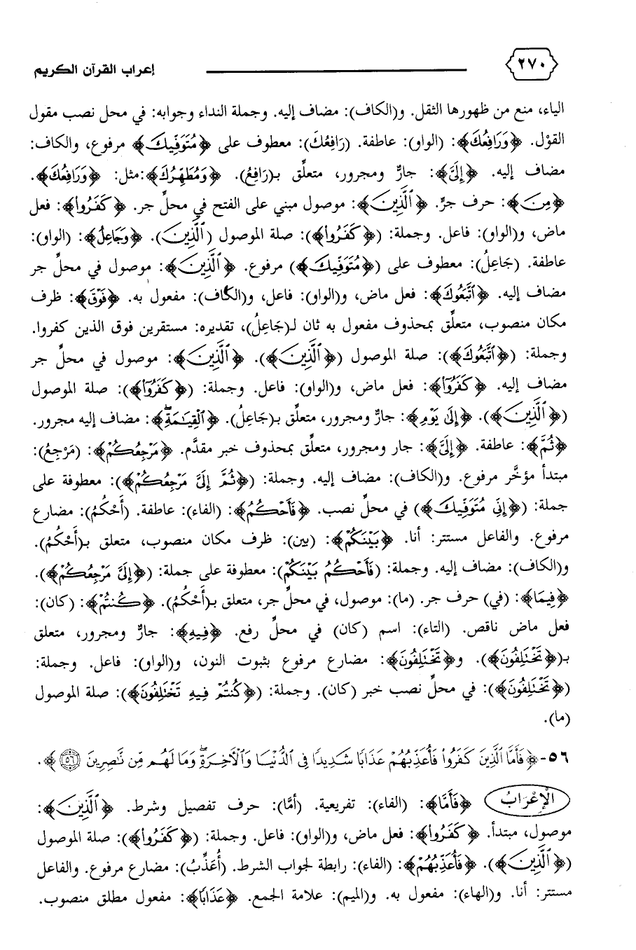 مبتدأ مؤخّر مرفوع. و (الكاف): مضاف إليه. وجملة: {ثُمَّ إِلَيَّ مَرْجِعُكُمْ}: معطوفة على جملة: {إِنِّي مُتَوَفِّيكَ} في محلّ نصب. {فَأَحْكُمُ}: (الفاء): عاطفة. (أحكم): مضارع مرفوع. والفاعل مستتر: أنا. {بَيْنَكُمْ}: (بين): ظرف مكان منصوب، متعلق ب (أحكم).
